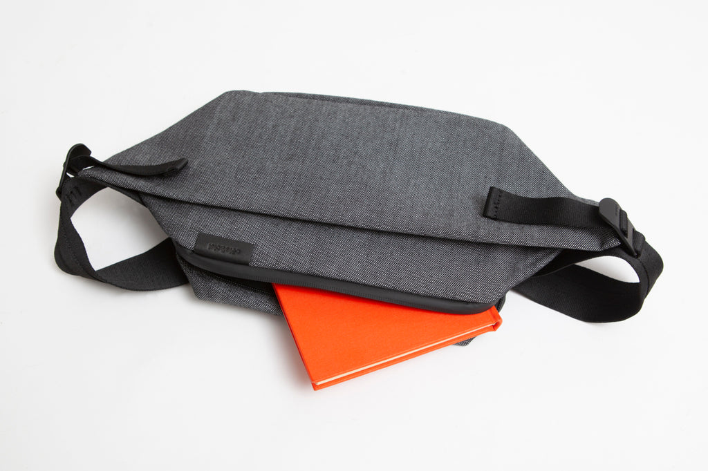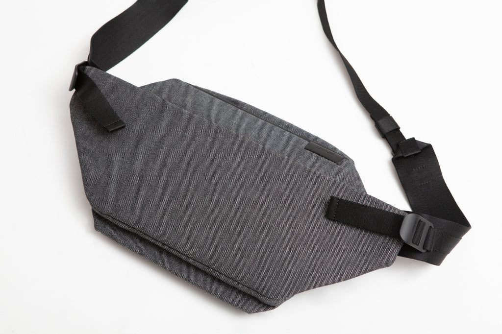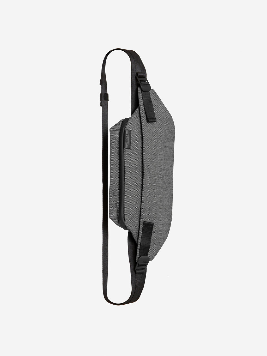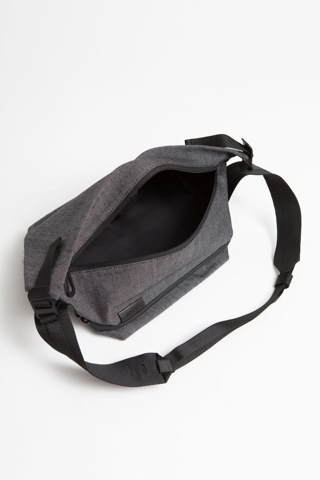 The front of this Isarau is constructed from Steel Black, the back from black EcoYarn. Internally, the Isarau Steel Black features a black interior lining with two main compartments, a padded device pocket which closes with a magnetic tab and a zipped pocket. In addition, this sling bag features black zips and straps and matt black metal trims.