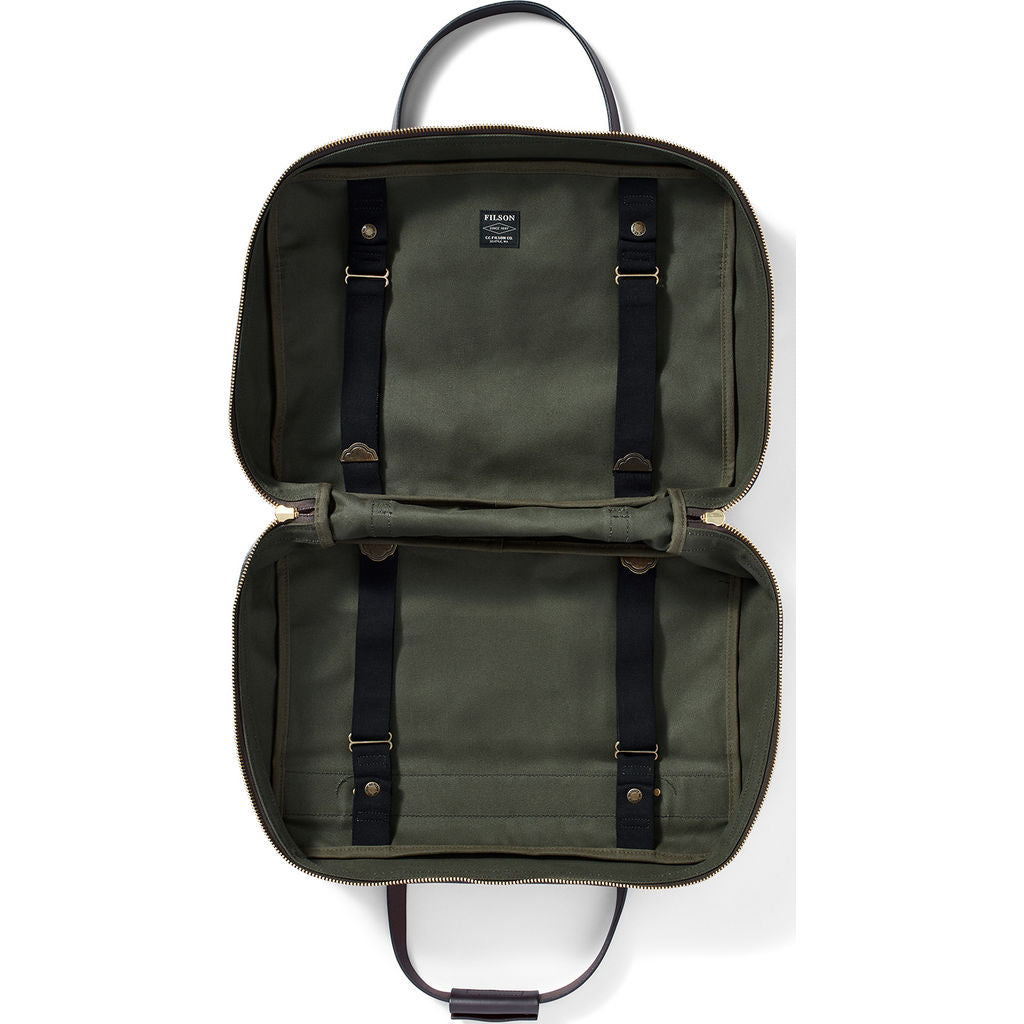 The classic Filson Small Pullman Bag was originally created to fit under the seat of a Pullman railroad car. Now this abrasion-resistant otter green bag meets standard airline carry-on size requirements. Featuring a spacious interior that opens fully and lies flat for easy packing. You can adjust the interior cotton elastic straps hold everything in place. The leather shoulder strap is removable so you can carry it however you like.