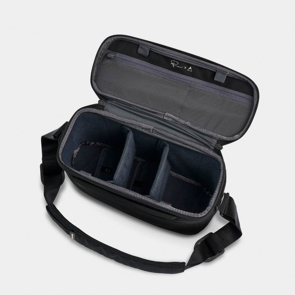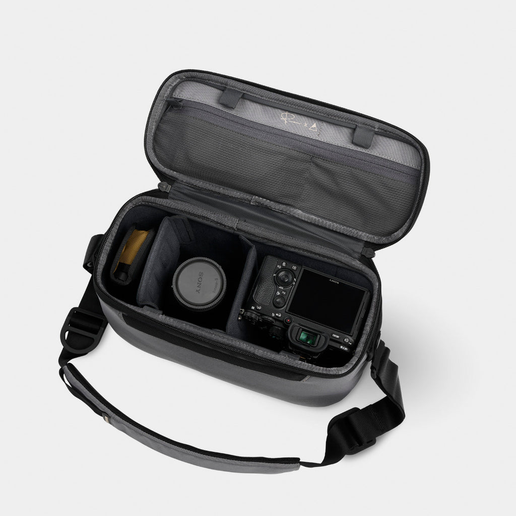 The Luma Camera Sling 12L, Designed in collaboration with Peter McKinnon, is a photographer's compact powerhouse. Despite its slender silhouette, the Luma Camera Sling 12L is deceptively spacious, accommodating an impressive amount of gear. When you prefer to forgo the bulk of a backpack, this sling proves itself with its generous interior. Inside there are customizable, shelved dividers that allow for flexible gear organization tailored to your specific needs. The top opens fully for immediate, fuss-free access, with magnetic closures for the moments in between shots, keeping them secure. Inside, you will also find internal pockets for small essentials and an external pocket tailored for quick-reach items like phones.