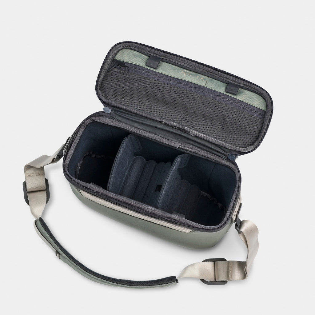 Beyond its storage capabilities, its design provides comfort and durability. The adjustable shoulder strap, cushioned with a pad, ensures a snug fit, fortified by robust pivot rivets. The secondary grab handle is perfect for those quick pick-up moments and doubles as a luggage pass-thru. Discover a zippered pocket revealing two stretch mesh compartments inside the lid, enhancing organization. A durable metal frame ensures the sling retains its shape, and a hook and loop interior holds dividers firmly. Innovative accordion-shaped dividers, some with an added shelf, further maximize space. This sling is a blend of function and craftsmanship tailored for photographers.