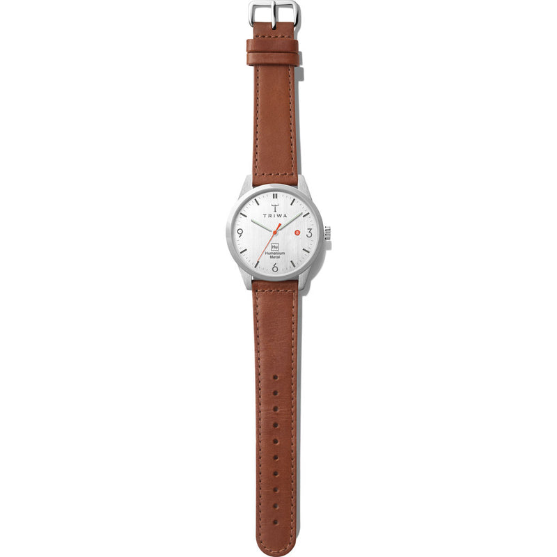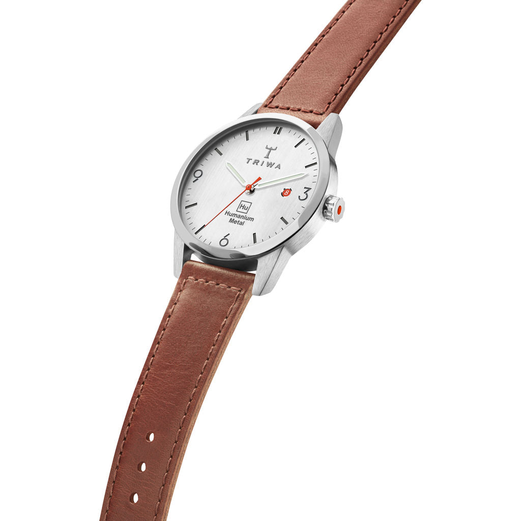 Triwa transforms a material from painful history to a beautiful representation of a brighter future. Part of the Humanium watch collection, the Hu 39L White watch with a brown leather strap is made from destructed illegal firearms. Aimed aims to highlight the issues of gun related violence through each time piece. For each watch sold Triwa gives back 15% to IM, Swedish Development partner and their support to conflict torn societies. Crafted with Triwa's signature Miyota movement and design. The watch is developed with the deepest respect to the material and is filled with symbolic references to the cause.