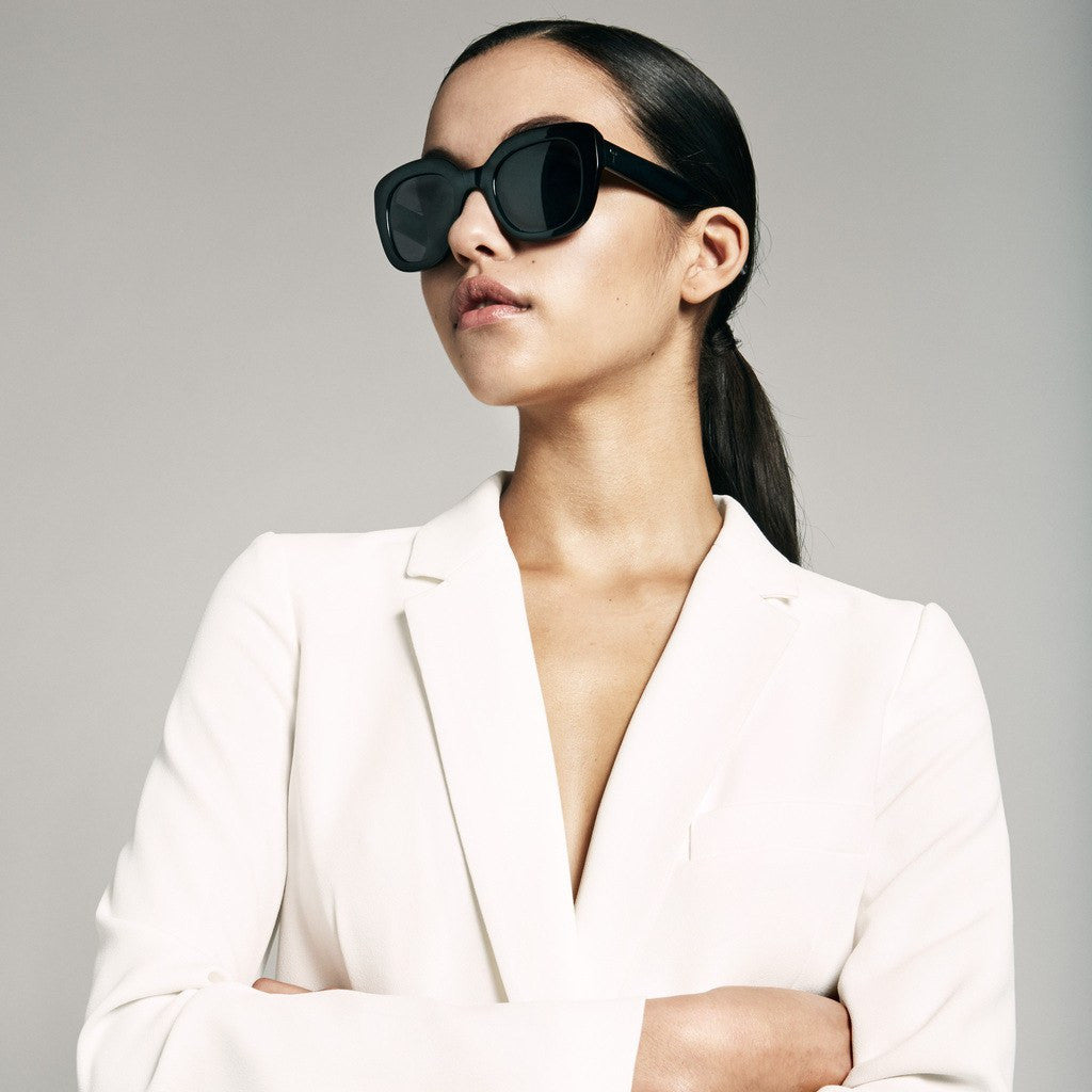 These Ingrid Sunglasses in Midnight are inspired by the classic butterfly look, toned down but with a clean and polished color palette. The black coloring with transparent ends make for a bold and elegant look. Carl Zeiss lenses provide you with 100% UV protection.