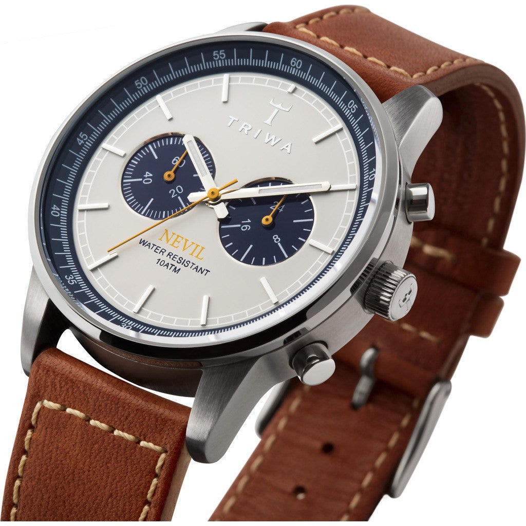 Sophistication with perfect functionality. The Ocean Nevil Watch is a cornerstone model within the Triwa chronograph family that combines contemporary and classic designs. It balances sportiness with elegance that makes this watch an experience to have. Finished with a brown sewn classic leather strap, this watch is perfect for a touch of class for those who live an active lifestyle.