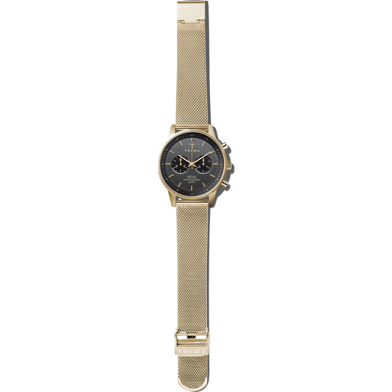 The Raven Nevil watch with Tumbled Brown leather strap is a classic chronograph with Triwa's signature time display. Stay comfortable with the easy to wear gold steel mesh strap. Go bold with the gold and black combination that is simple and sophisticated for special life moments.