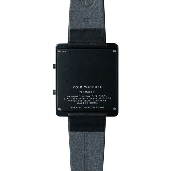 The V01MKII LCD Watch is a modern take on VOID's minimalist square watch design. Designers and watch collectors around the world love this VOID signature piece. The sand blasted stainless steel has a matte appearance for a subtle look. The sapphire crystal protects the high contrast LCD display. This futuristic watch comes with a leather strap that to give it a classic touch.