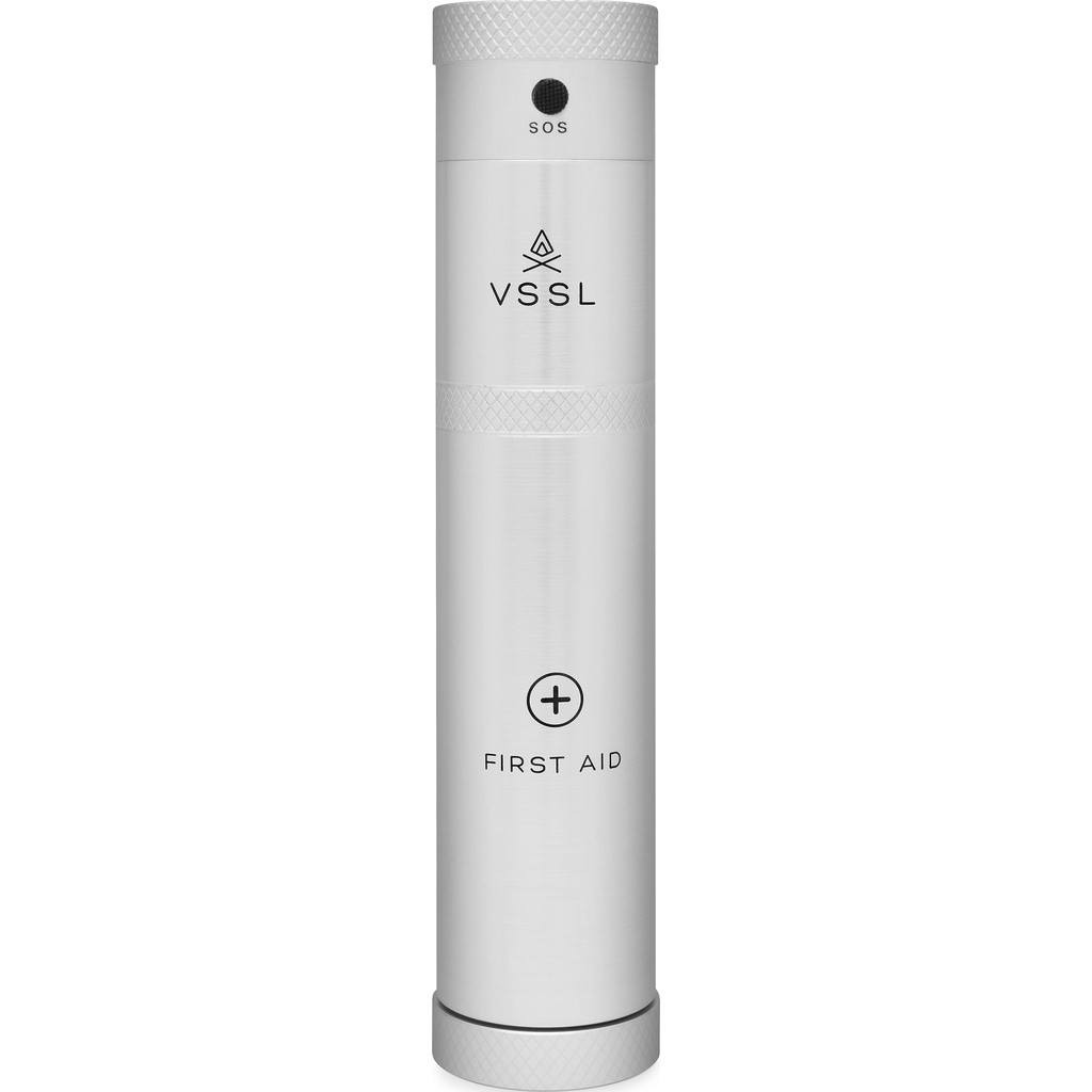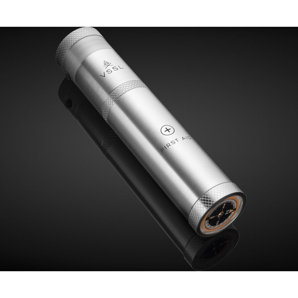 VSSL makes sure you're safe and sound anywhere you go with the First Aid and Personal Care Kit. Constructed with seamless extruded military specification anodized aluminum, this waterproof cylinder holds an emergency whistle, 4 antiseptic wipes, 1 cleansing wipe, 1 soap wipe, 1 triple antibiotic ointment, 2 cotton pads, 24 bandages, 4 Ibuprofen tablets, 4 Aspirin tablets, 4 Safety pins, a pair of tweezers, a razor blade, a roll of medical tape, a roll of gauze tape and a pair of nitrile gloves.