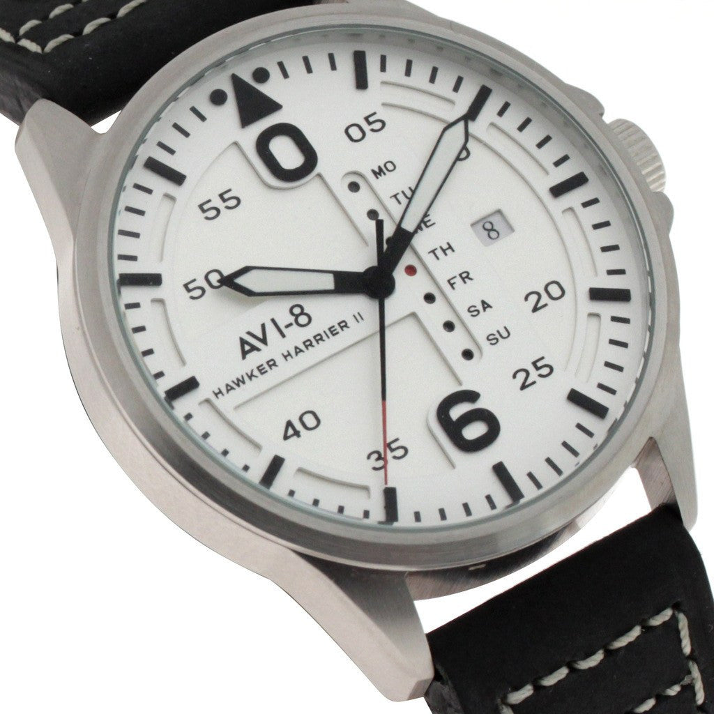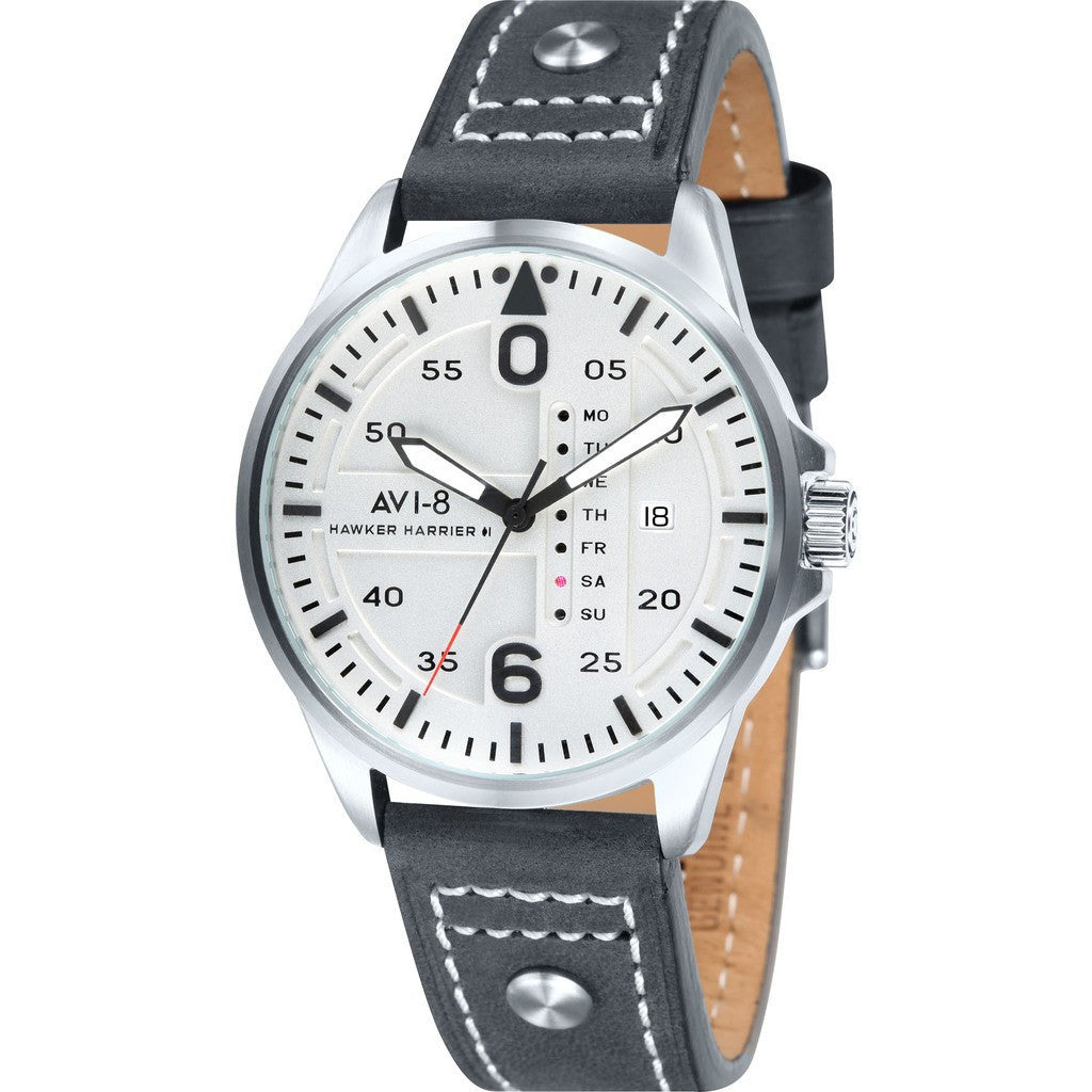 AVI-8 focuses on functionality with the Hawker Harrier II AV-4003-01 Watch. AVI-8 crafted this watch with a white gauge-like dial with enlarged luminous hands housed in a solid Stainless Steel case. Finished with a Genuine Leather Strap, this timepiece is perfect for any occasion. AVI-8 makes sure you'll always be on time with precise Japanese Quartz movement.