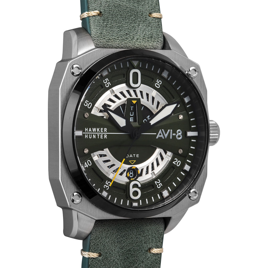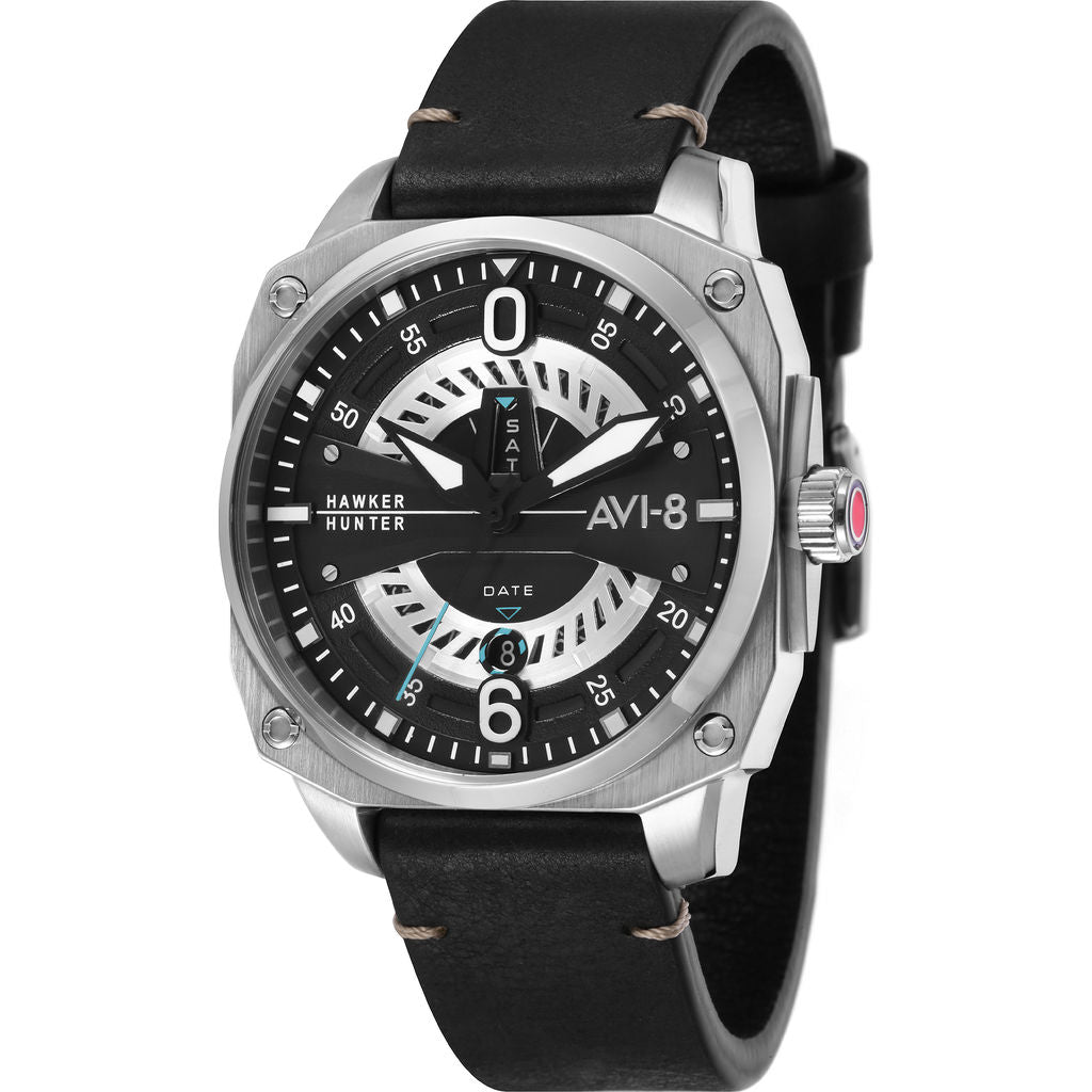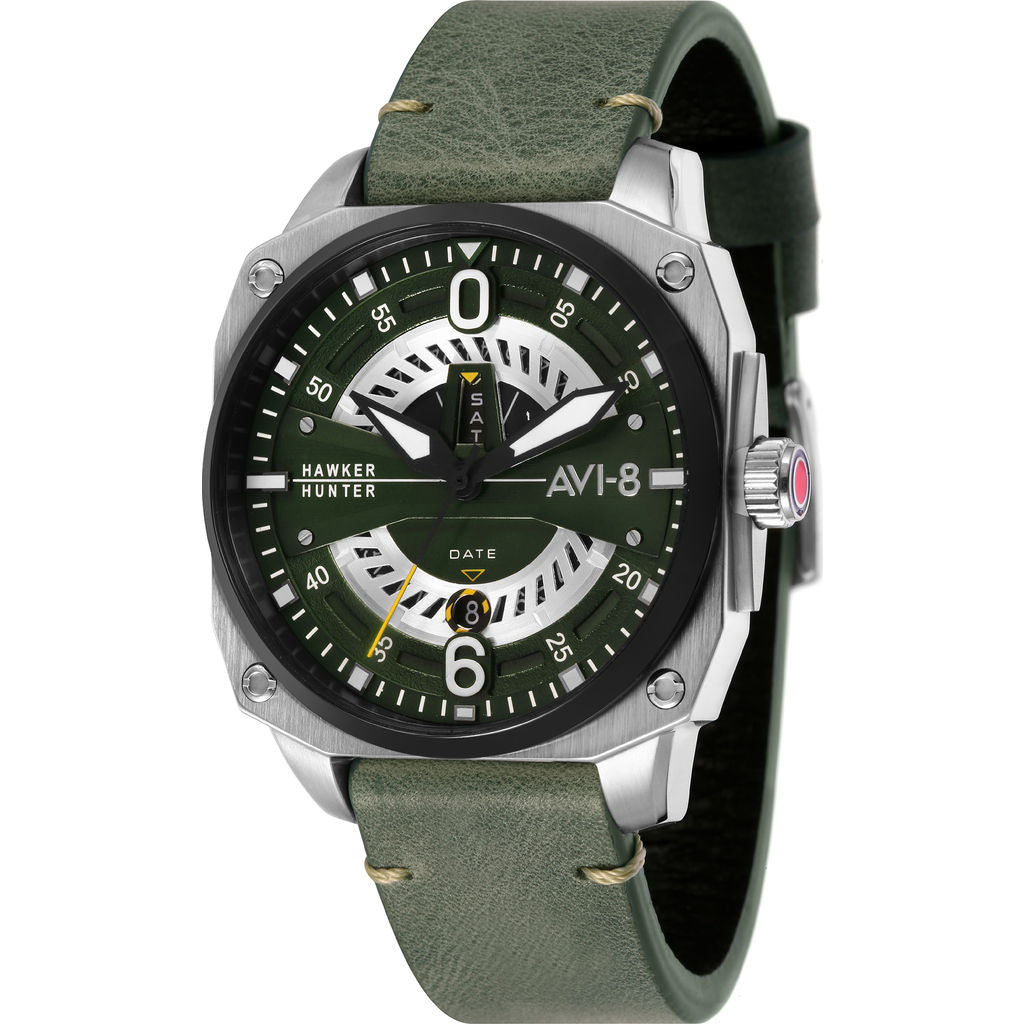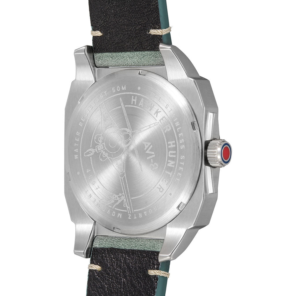 The Hawker Hunter AV-4057 Chronograph watch is a piece of art with its squared shape face. Inspired by the famed military jet that first flew in service for the RAF in the early 1950s. Outlined hands are bold yet skeletonize to offer clarity and visibility of all sub dials on the multi-layered dial that offers depth and detail for the wearer. Snugly strapped to the wrist with a hand stitched vintage genuine leather strap – the AV 4057 is an impressive, functional and unique aviation inspired timepiece like no other. A bold accessory that will make a statement with any outfit.