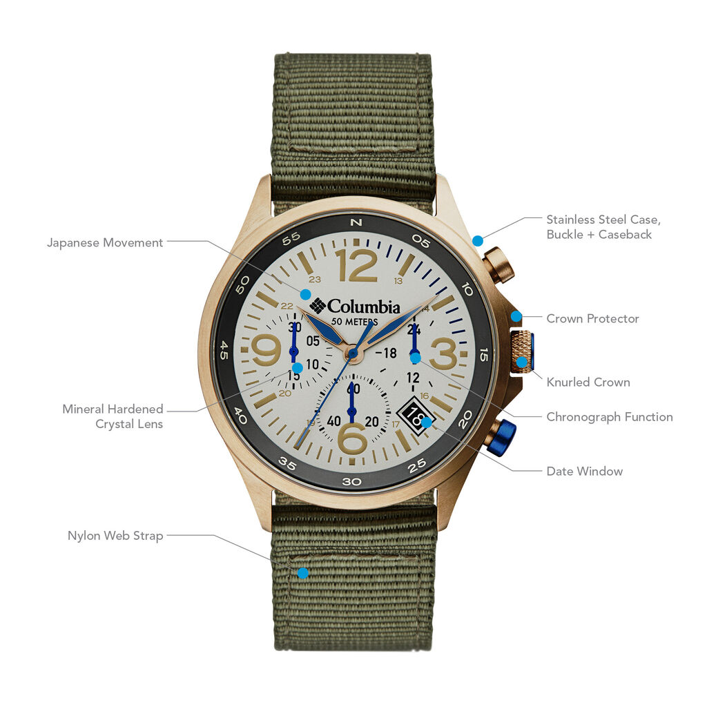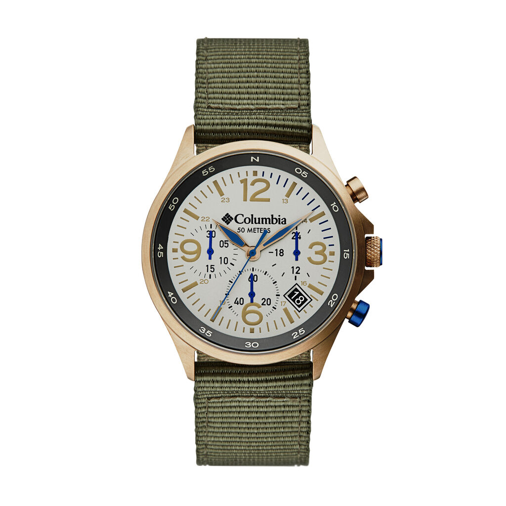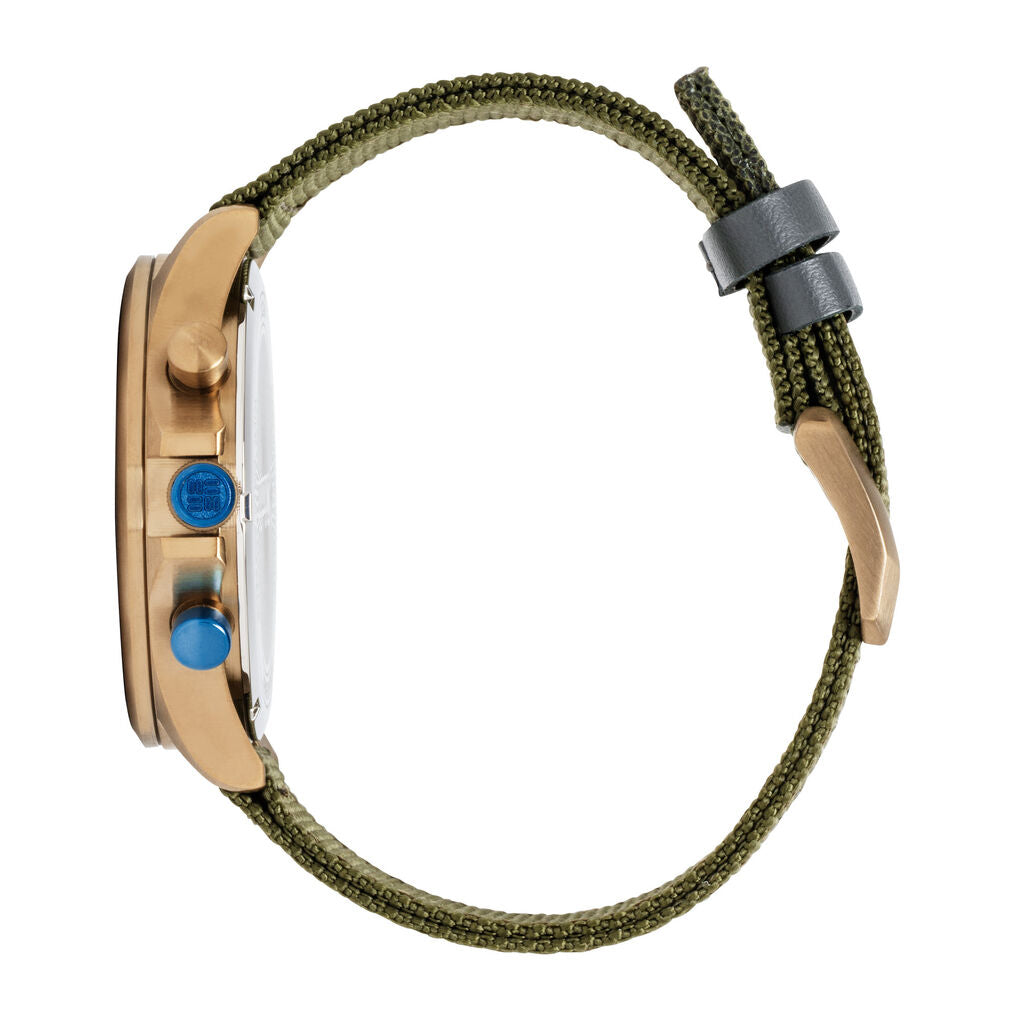 The case’s diameter measures at 42mm and it is made of stainless steel, in order to increase the longevity of the watch. The gold bezel is fixed and it gives the watch with a sophisticated feel. It also features three knurled crown that is situated at the 2, 3 and 4 o’clock marks. Knurled crowns are also used on the widely respected Seiko SKX divers.