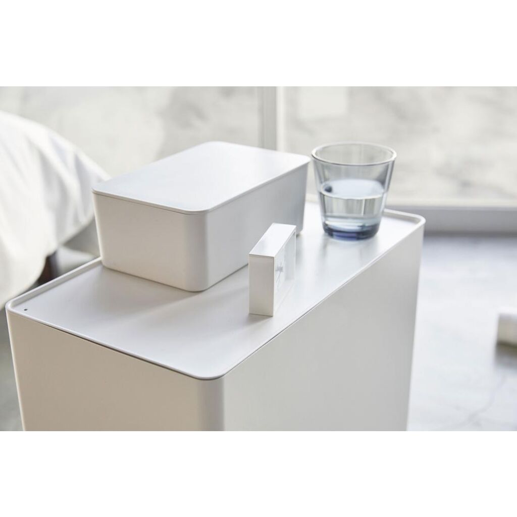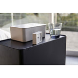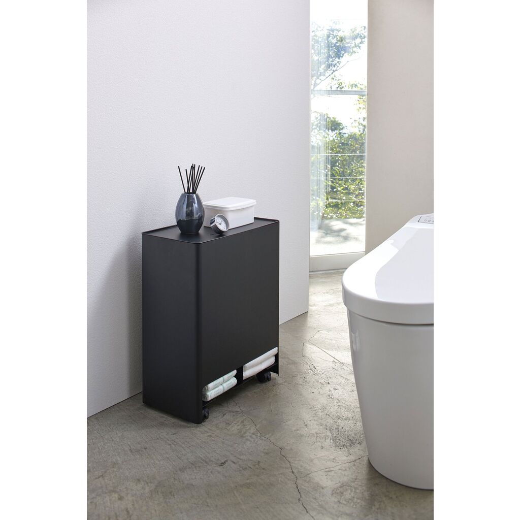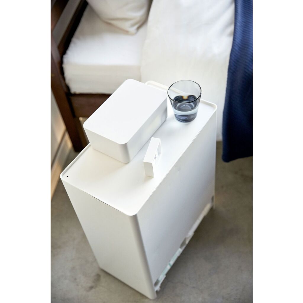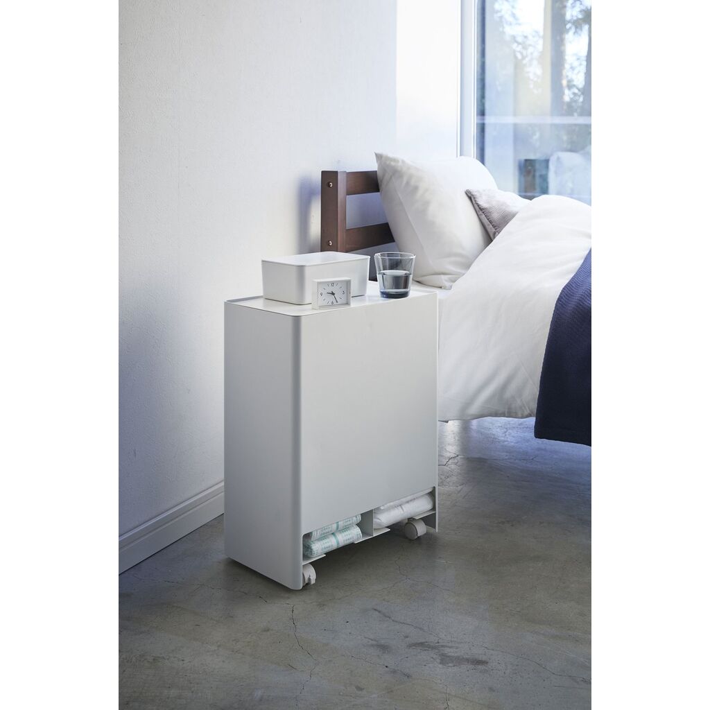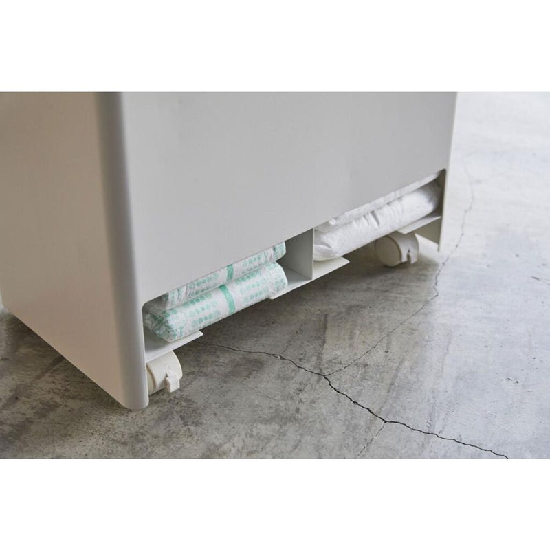 A diaper magician.Poof and the diaper storage unit rolls towards the wall, transforming the unit into a simple side table. Wheel the unit back out again to pop a nappy from the bottom of the stack. Lift open the lid to insert a fresh stack. The recessed top also fits our Wet Tissue Case perfectly, matching the minimalist aesthetic of the diaper holder.