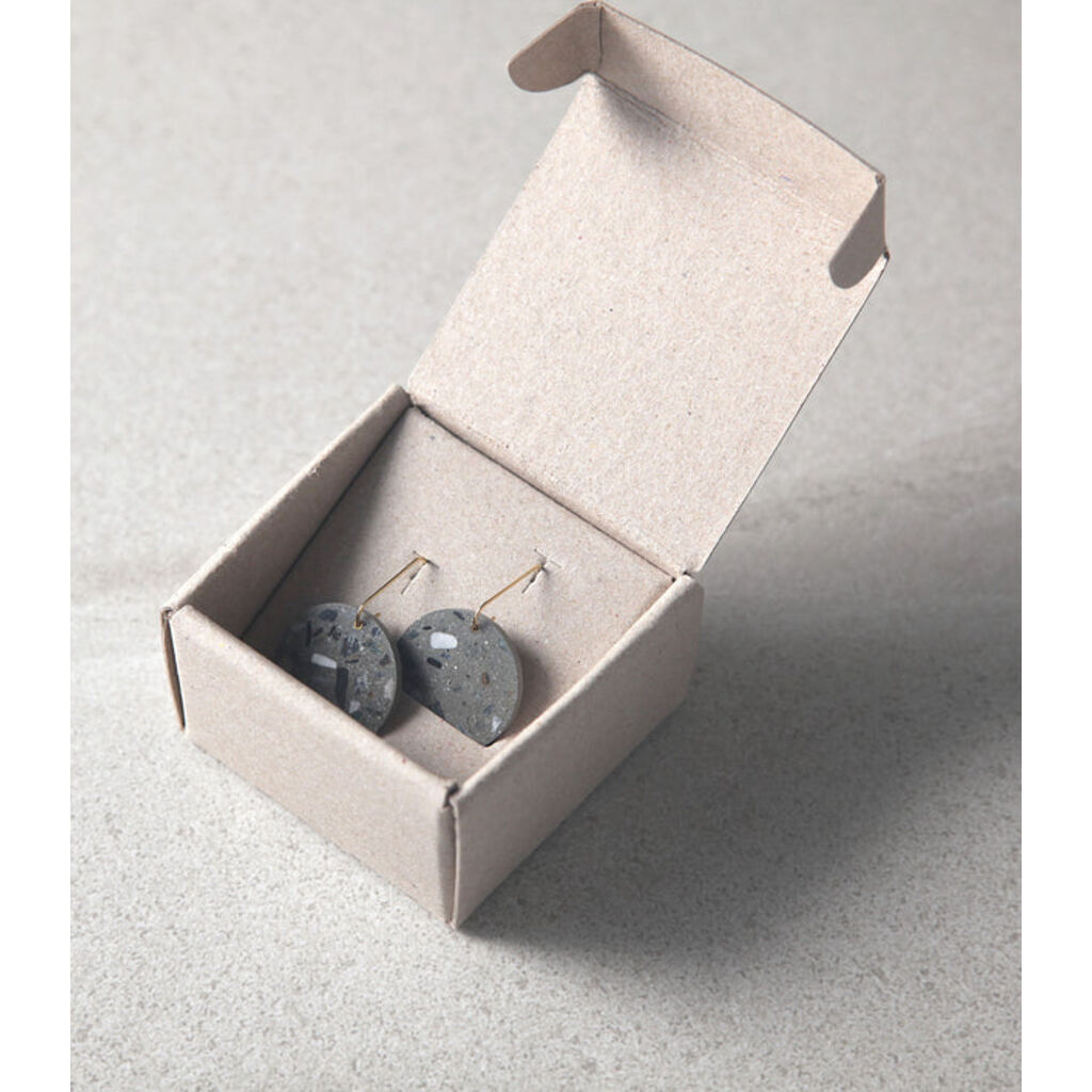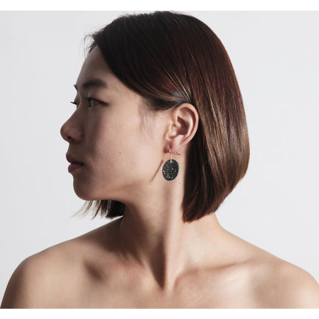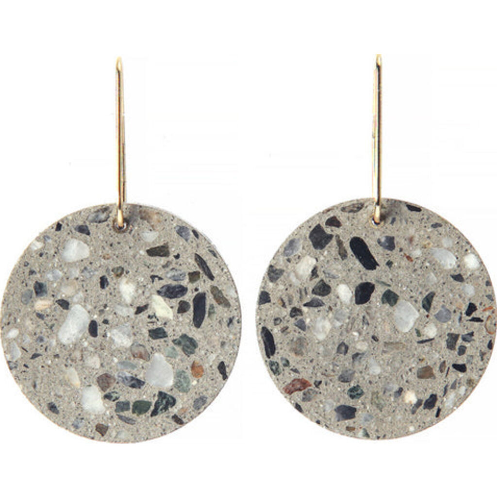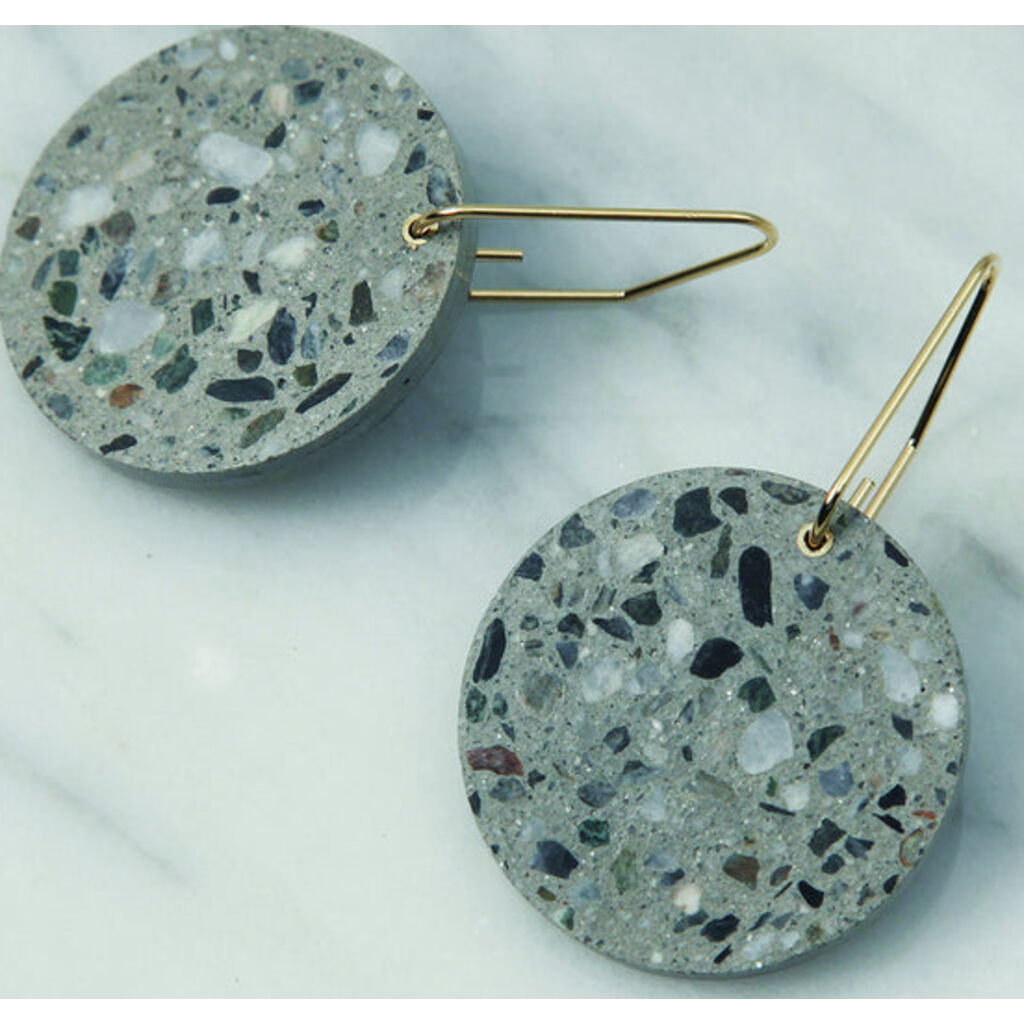 The quietly striking image of the Circle Earrings is created by a meticulous production process of mixing, blending, pouring, finishing, sanding, and polishing. The chance arrangement of small marble fragments inside the earrings contrasted with the circular form gives these earrings their personality while their 18K gold-plated hooks add an additional lustrous touch.