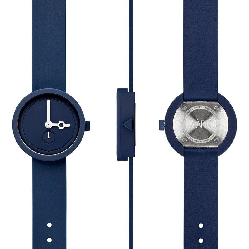 The AÃRK Classic Watch in Navy is exactly what its name implies: minimal, simple, and timeless. This timeless navy watch will complement almost any look. The only complicated thing about The Classic watch? Choosing which color to tie your outfit together. With an outer shell made from durable PU plastic, an internal stainless steel case safeguarding the precise Japanese Quartz movement, and a matte satin finish on the case and band, The Classic boasts quality that reflects in its beauty.