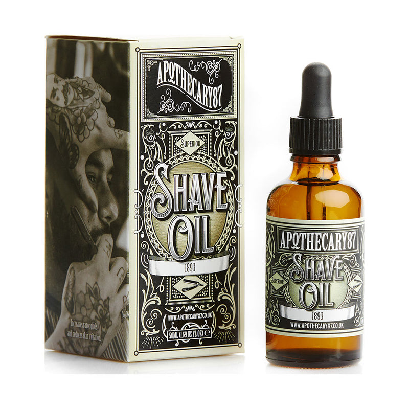 A thick, nourishing oil designed for use before and after shaving to enable better blade glide and sooth skin. Apothecary 87's carefully formulated shaving oil softens the beard prior to shaving and provides antiseptic properties which effectively reduce and sooth bumps and razor burn. The 1893 scent pays homage to the year the first barber school was opened; a balance of sweet notes of vanilla and spicy tones of sandalwood offer a relaxing experience reminiscent of sitting in a barbershop chair.