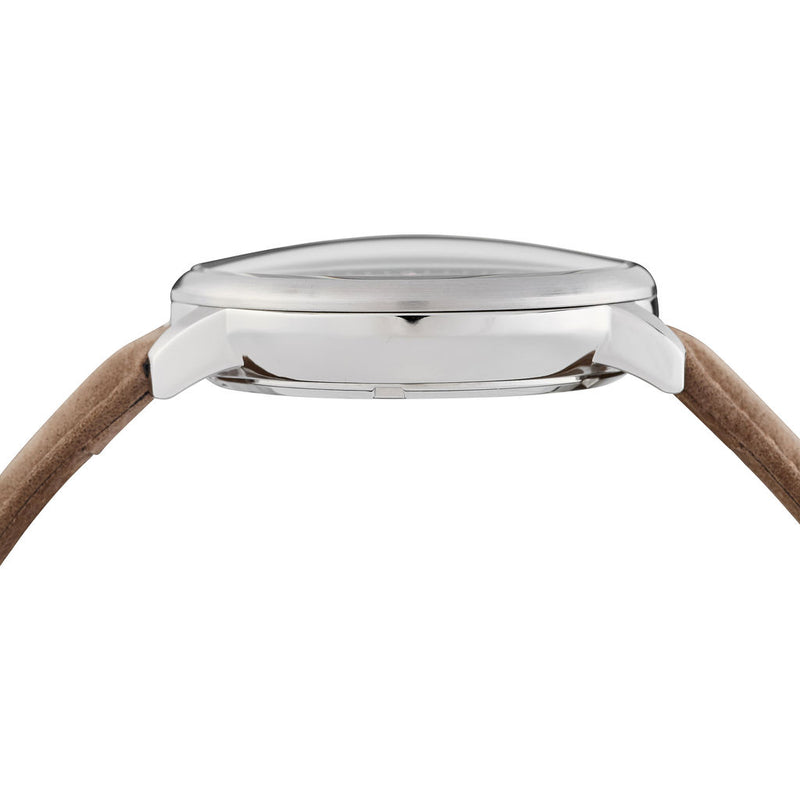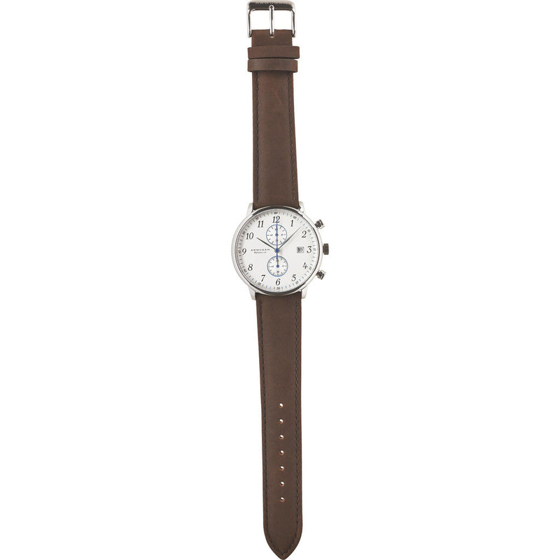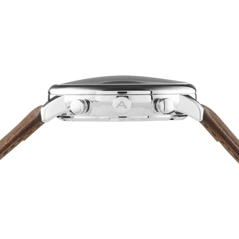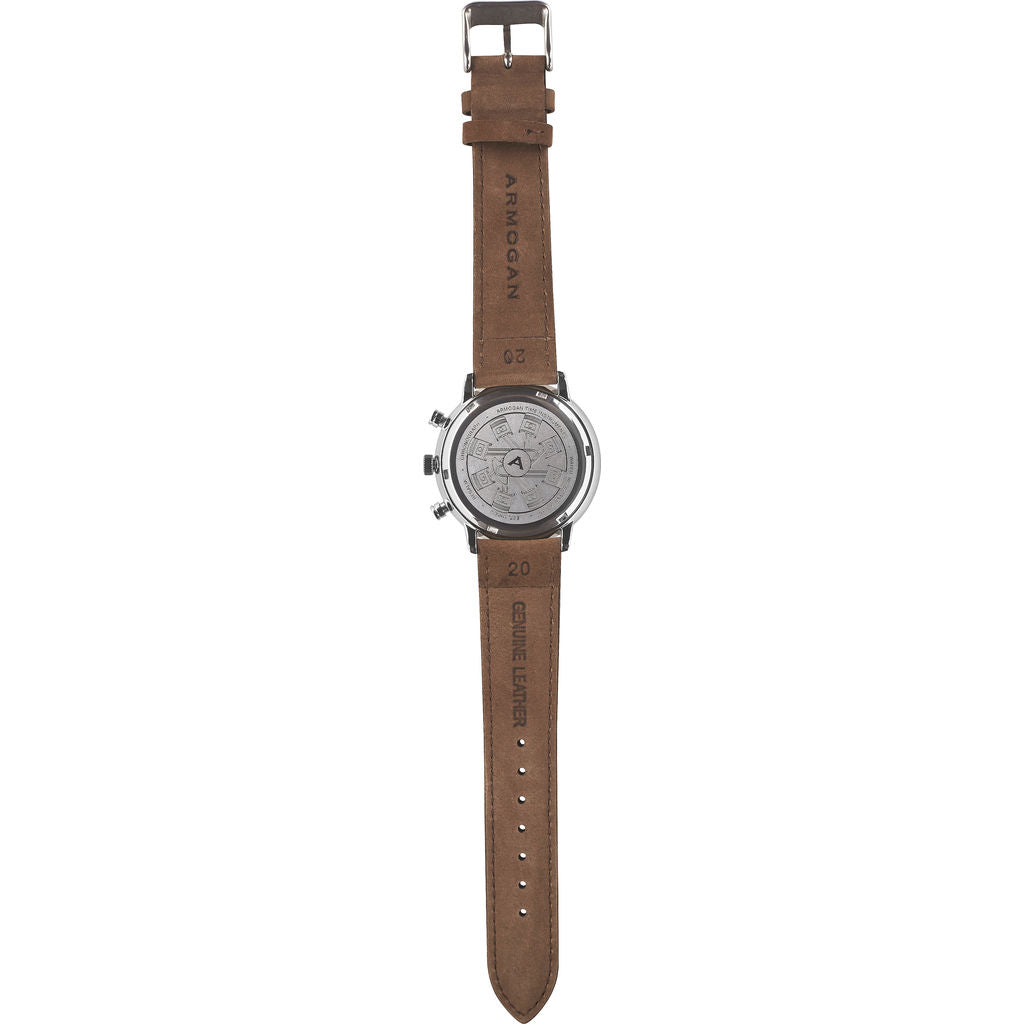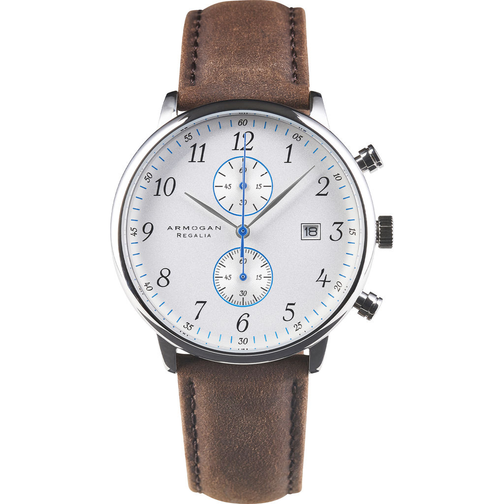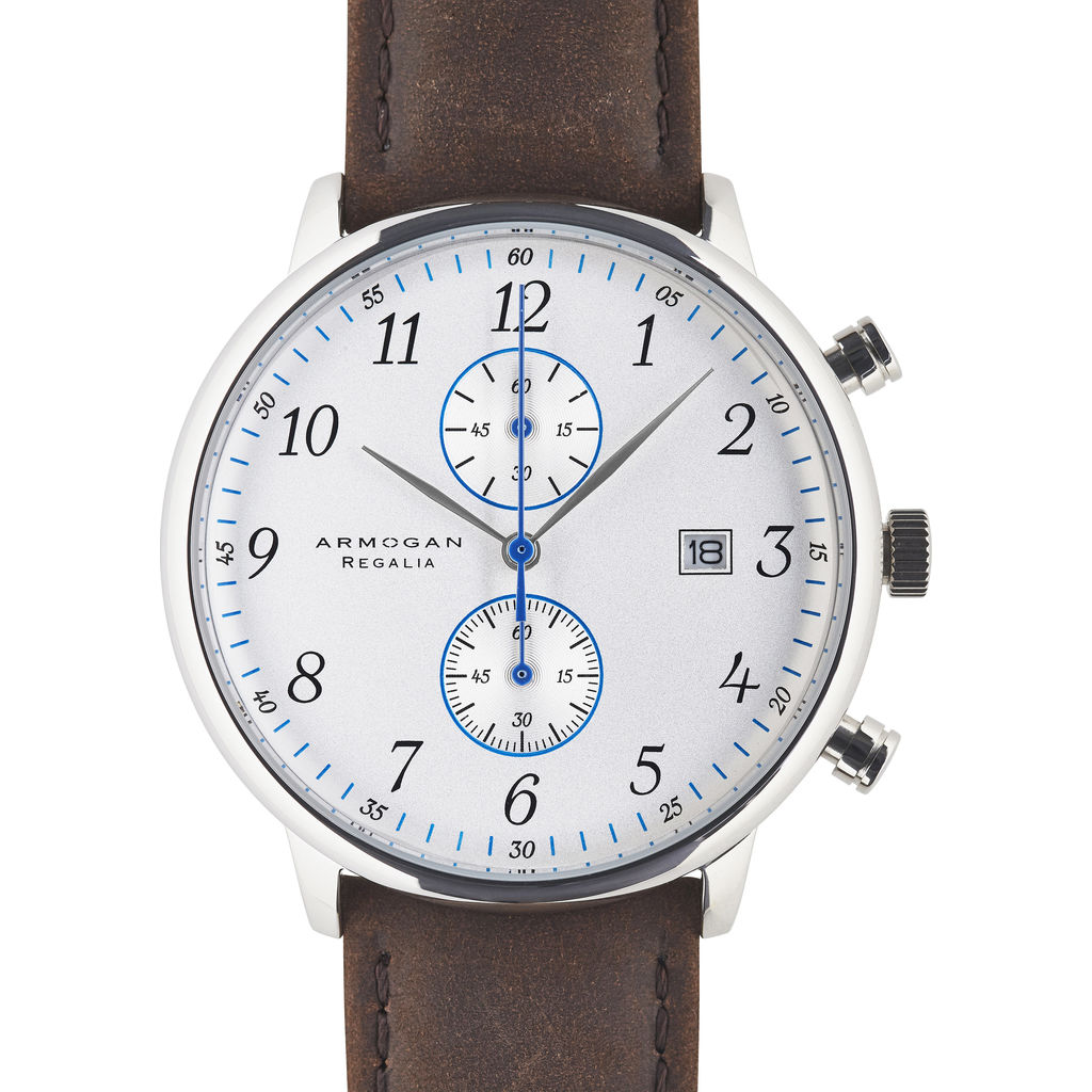 The Armogan Silvered White Regalia S-88 Chronograph Watch is sleek and stylish. Built for speed, the Regalia is a 2 counters chronograph featuring a domed mineral crystal, a Miyota OS11 Chronograph movement, and a slim 40mm stainless steel case. This watch boasts a 60 minute sub-dial counter at 12 o’clock, a date indicator at 3 o’clock, a small running second at 6 o’clock and a stopwatch in the center. The back of the case has an etched piston design and the pushers are inspired by the shape of pistons. With blue accents on the face, there is nothing not to love! The strap is made of vintage leather which will develop a beautiful patina over time.