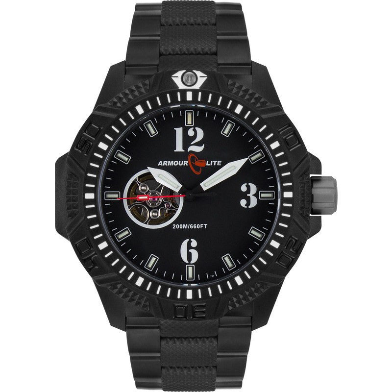 The Armourlite Caliber Series Watches feature cases built from a lightweight polycarbonate material combined with sapphire crystal for durability. The Automatic movement means you will always have accurate, reliable time regardless of a battery and the tritium illumination makes the time visible in the worst of light conditions. The Physical Vapor Deposition Steel band provides a classy look with comfort and durability.