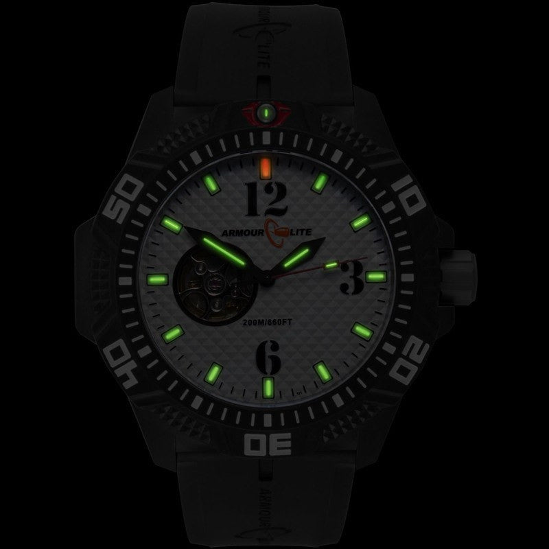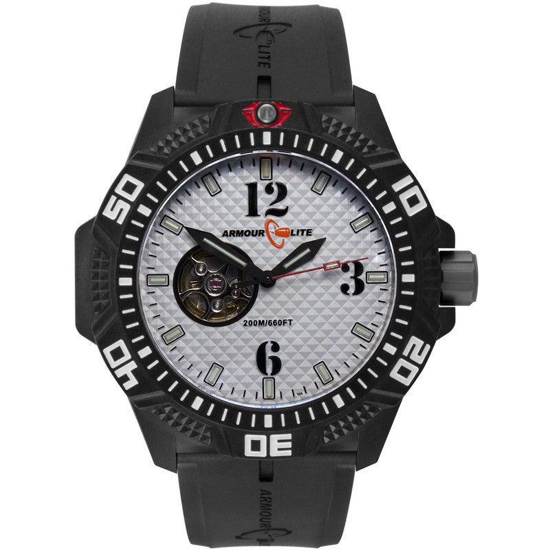 Armourlite's Caliber series watches feature cases built from a lightweight polycarbonate material combined with sapphire crystal for durability. The automatic movement means you will always have accurate, reliable time regardless of a battery and the tritium illumination makes the time visible in the worst of light conditions. The Nitrile Butadiene Rubber band gives a clean look and comfortable fit.
