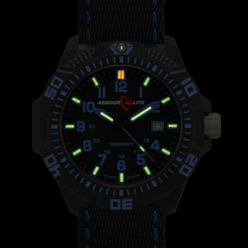 The Armourlite Caliber Series features a lightweight polycarbonate constructed case with sapphire crystal for durability. The nylon stitched band provides lightweight comfort and contrasting colors matching the face.