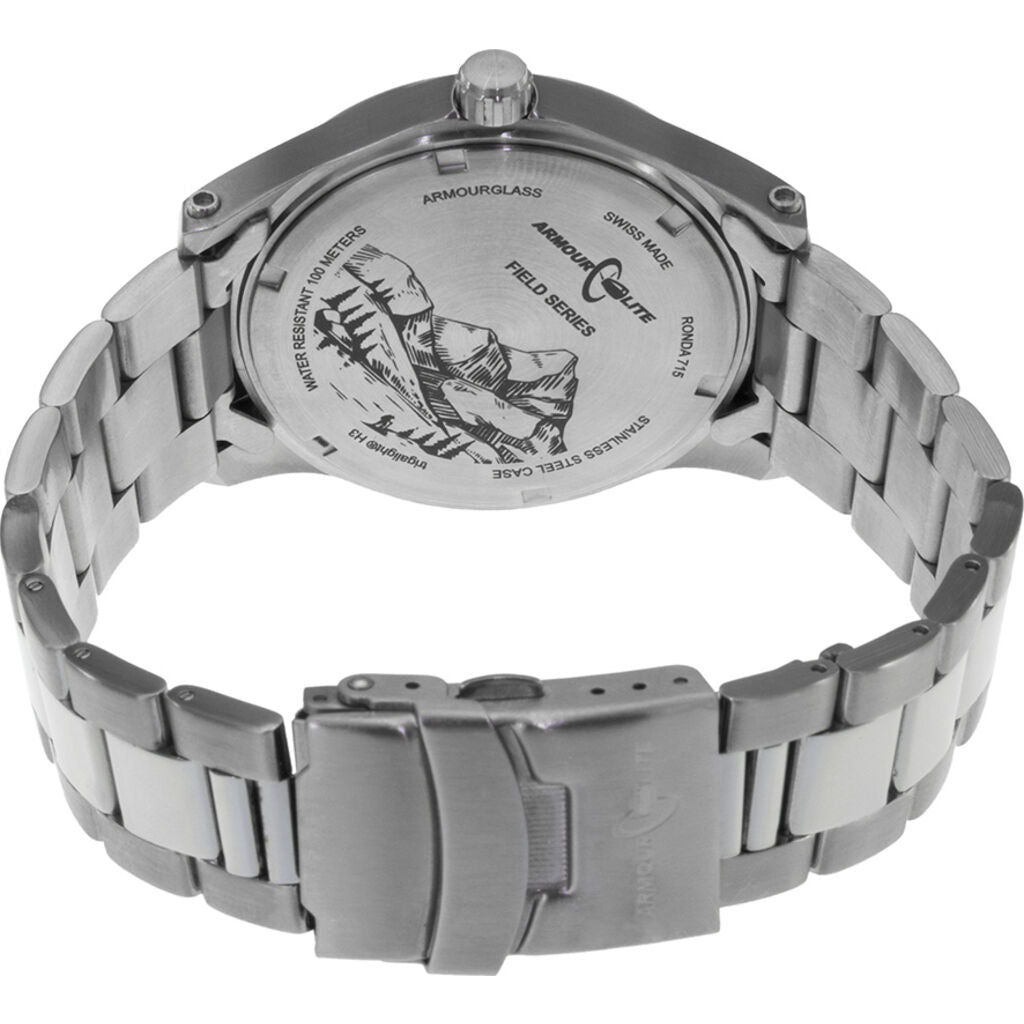 Each model in this series is protected by our unique shatterproof Armourglass crystal that has a hardness rating of 6,000 Vickers — whereas most watch crystals are only rated to 700 Vickers. For the utmost in reliability and timekeeping accuracy, each watch is powered by a maintenance-free Swiss Made Ronda 715 quartz movement with a date display at 3:00 and a low-battery indicator.