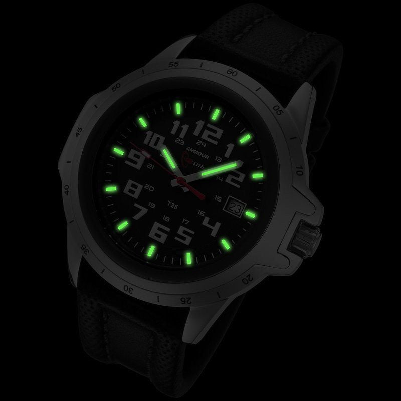 The Armourlite ColorBurst series watches feature colored numbers on the face with matching contrast stitching on the black leather band. As part of the Shatterproof collection, they also feature a shatterproof crystal resting on a stainless steel case for ultimate durability. Finally, tritium illuminated markers matching the contrast color provide visibility in any possible light conditions.