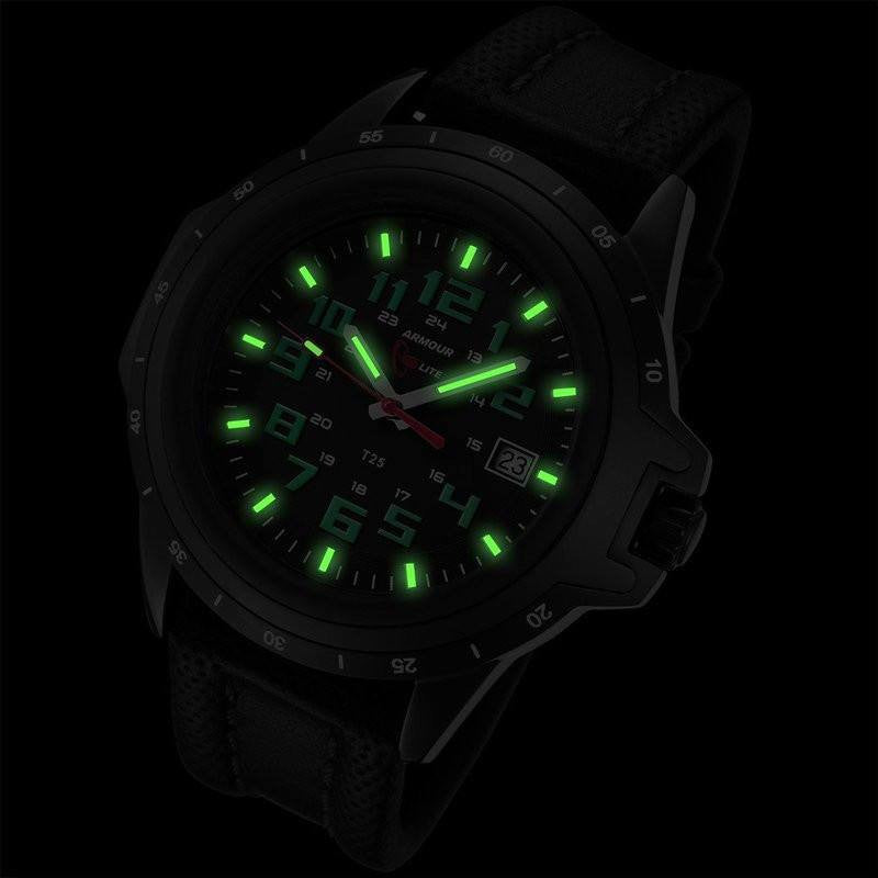The Armourlite ColorBurst series watches feature colored numbers on the face with matching contrast stitching on the black leather band. As part of the Shatterproof collection, they also feature a shatterproof crystal resting on a stainless steel case for ultimate durability. Finally, tritium illuminated markers matching the contrast color provide visibility in any possible light conditions.