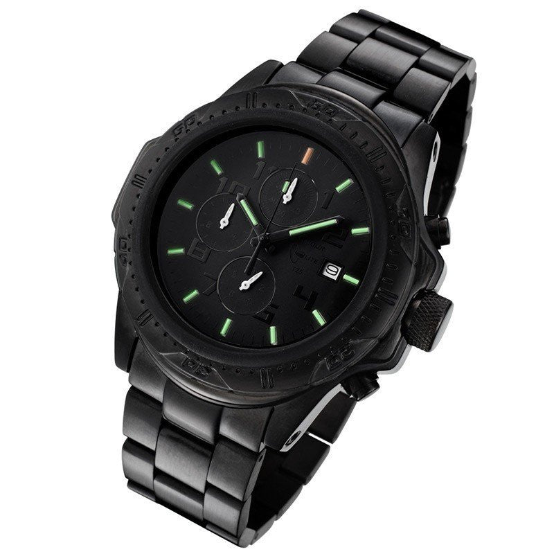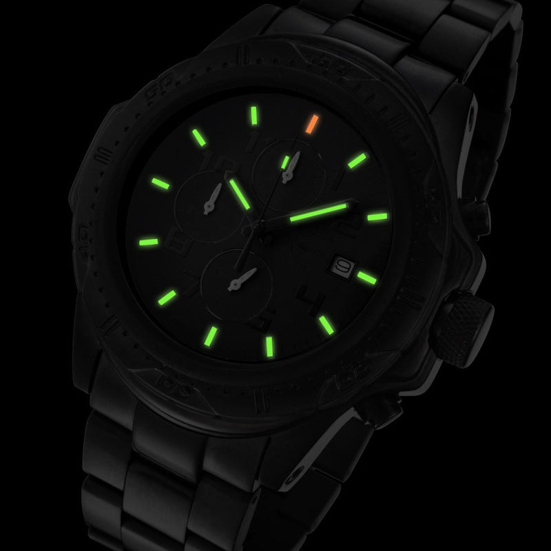 The Armourlite Stealth series watches feature all black on the face with a matching black steel band. As part of the Shatterproof collection, the AL60 also features a shatterproof crystal resting on a stainless steel case for ultimate durability. Finally, tritium illuminated markers matching the contrast color provide visibility in any possible light conditions.