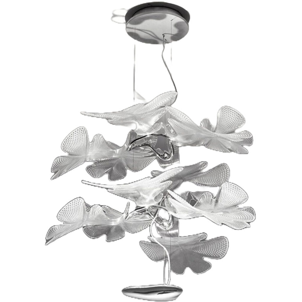 Phytomorphic elements of molded PMMA feature gently wavy texture and an uneven stepped section that works as an optical lens. The central suspended COB body acts as a heatsink and emits indirect light filtered and refracted by 3 clear leaf-shaped surfaces. Can be installed singly or in multiple compositions for scenic, reflected effects on the ceiling.