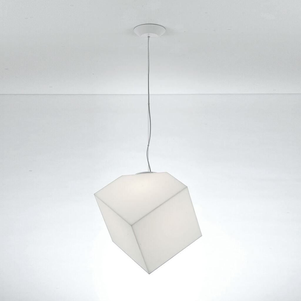 Cable suspended luminaire for diffused self-ballasted fluorescent or LED lighting (not suited for incandescent lighting).