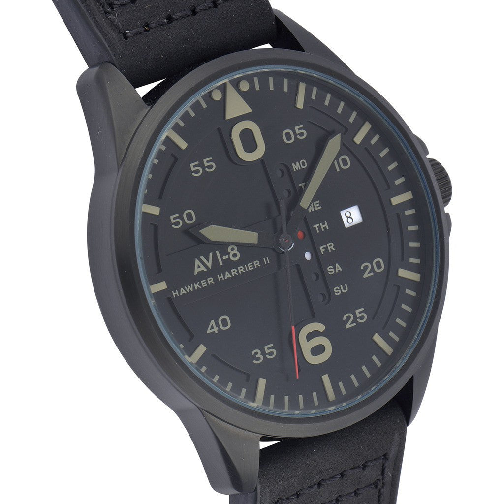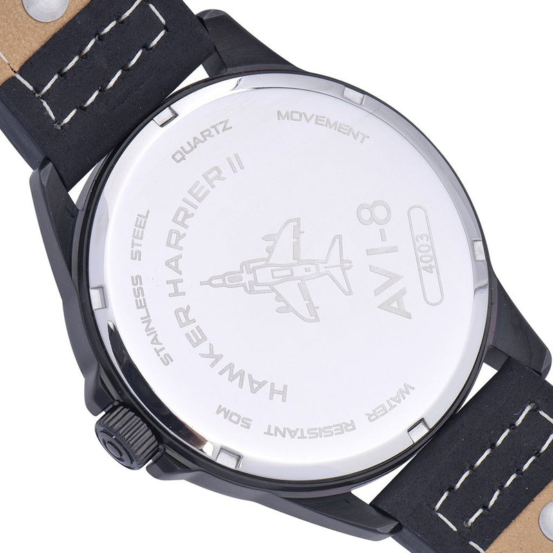 AVI-8 focuses on functionality with the Hawker Harrier II AV-4003-07 Watch. AVI-8 crafted this watch with a black gauge-like dial with enlarged luminous hands housed in a solid Stainless Steel case. Finished with a Genuine Leather Strap, this timepiece is perfect for any occasion. AVI-8 makes sure you'll always be on time with precise Japanese Quartz movement.