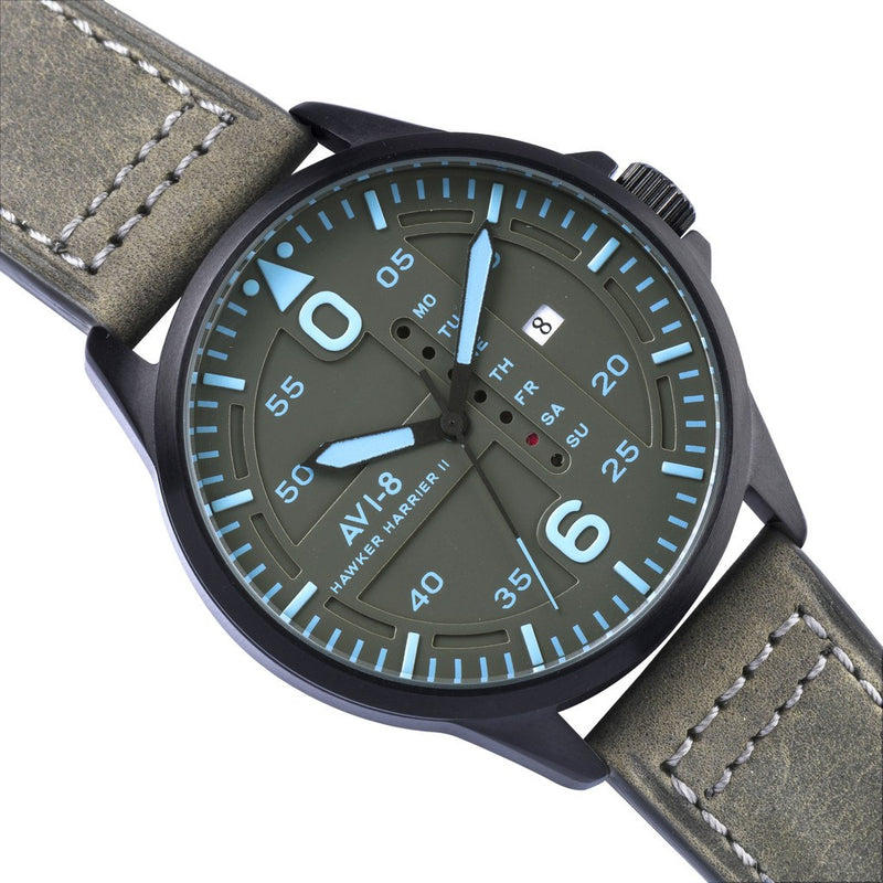 AVI-8 focuses on functionality with the Hawker Harrier II AV-4003-0A Watch. AVI-8 crafted this watch with a black gauge-like dial with enlarged luminous hands housed in a solid Ionic Plated case. Finished with a grey Genuine Leather Strap, this timepiece is perfect for any occasion. AVI-8 makes sure you'll always be on time with precise Japanese Quartz movement.