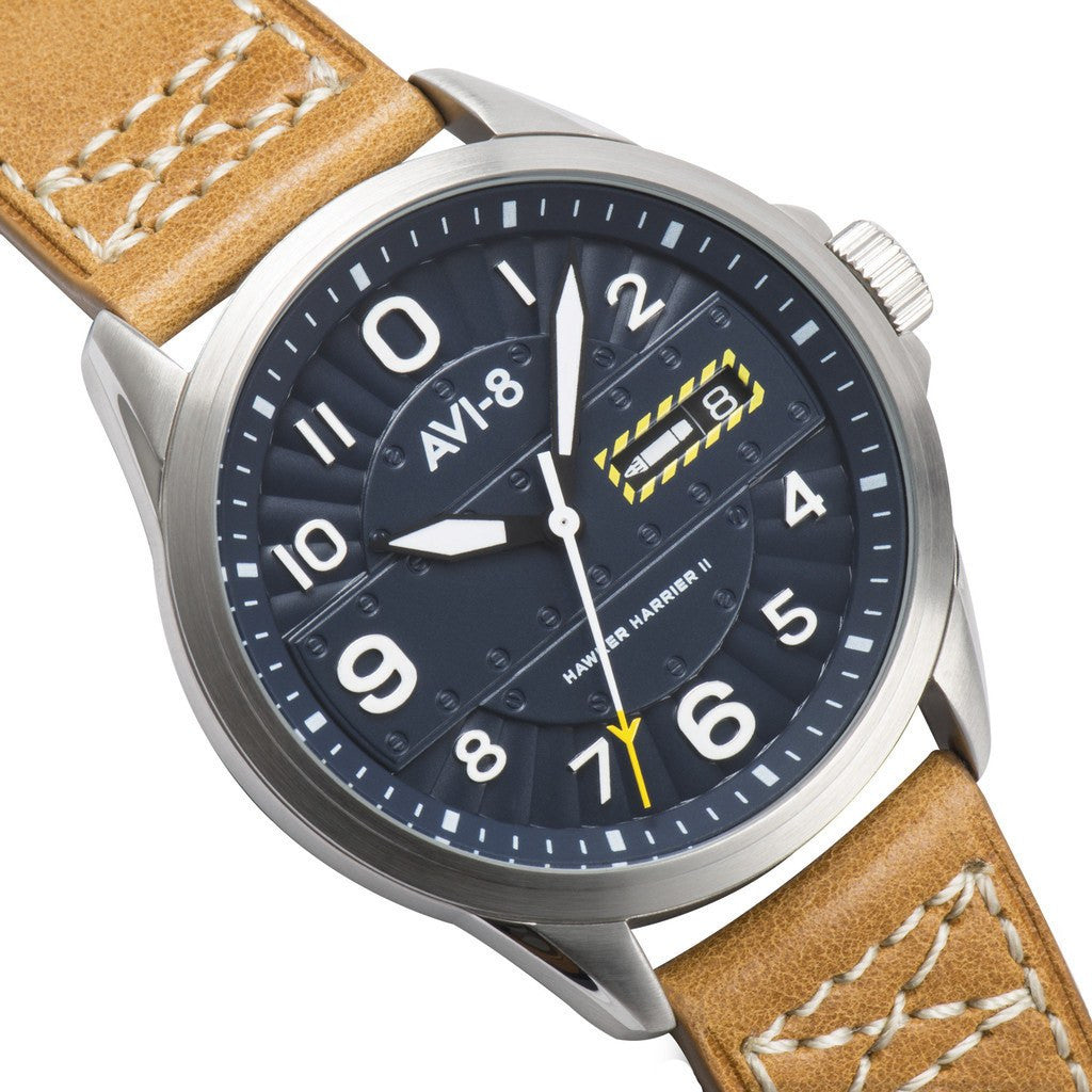 AVI-8 focuses on functionality with the Hawker Harrier II AV-4045-02 Watch. AVI-8 crafted this watch with a blue detailed dial housed in a solid Stainless Steel case. Finished with a Genuine Leather Strap, this timepiece is perfect for any occasion. AVI-8 makes sure you'll always be on time with precise Japanese Quartz Movement.