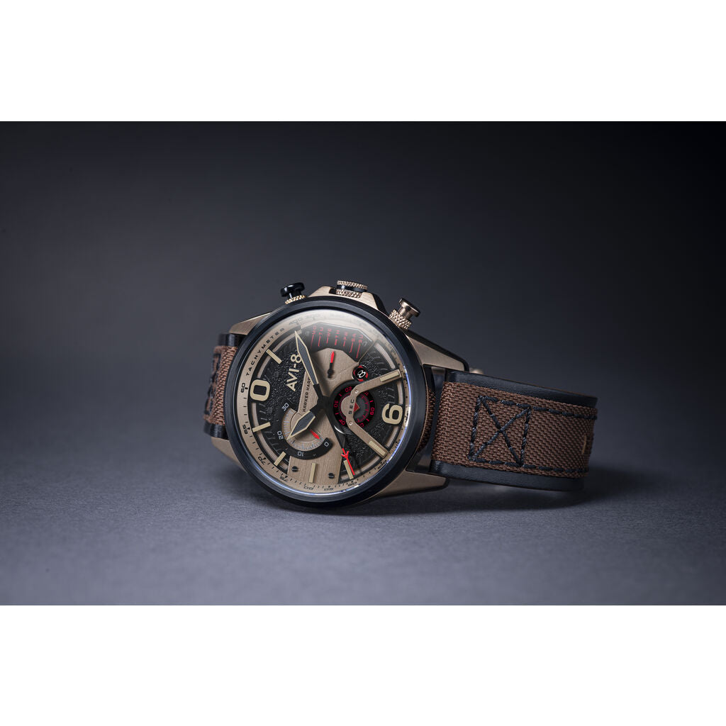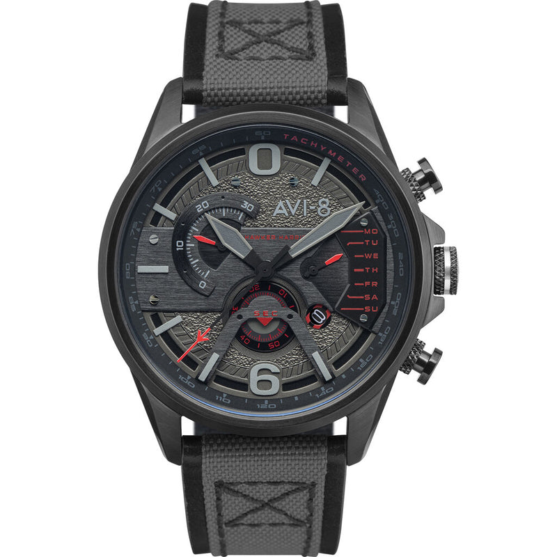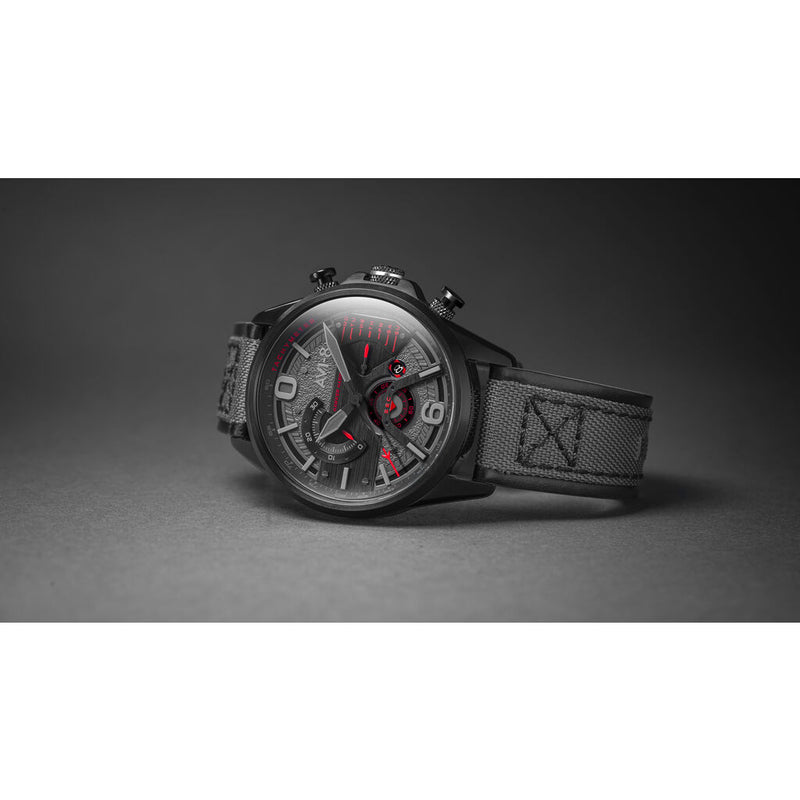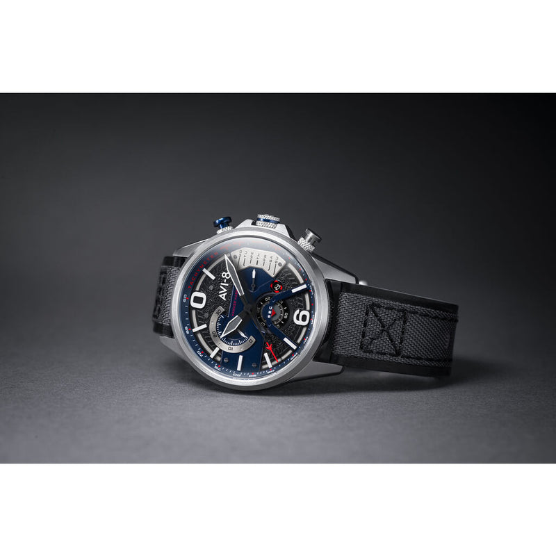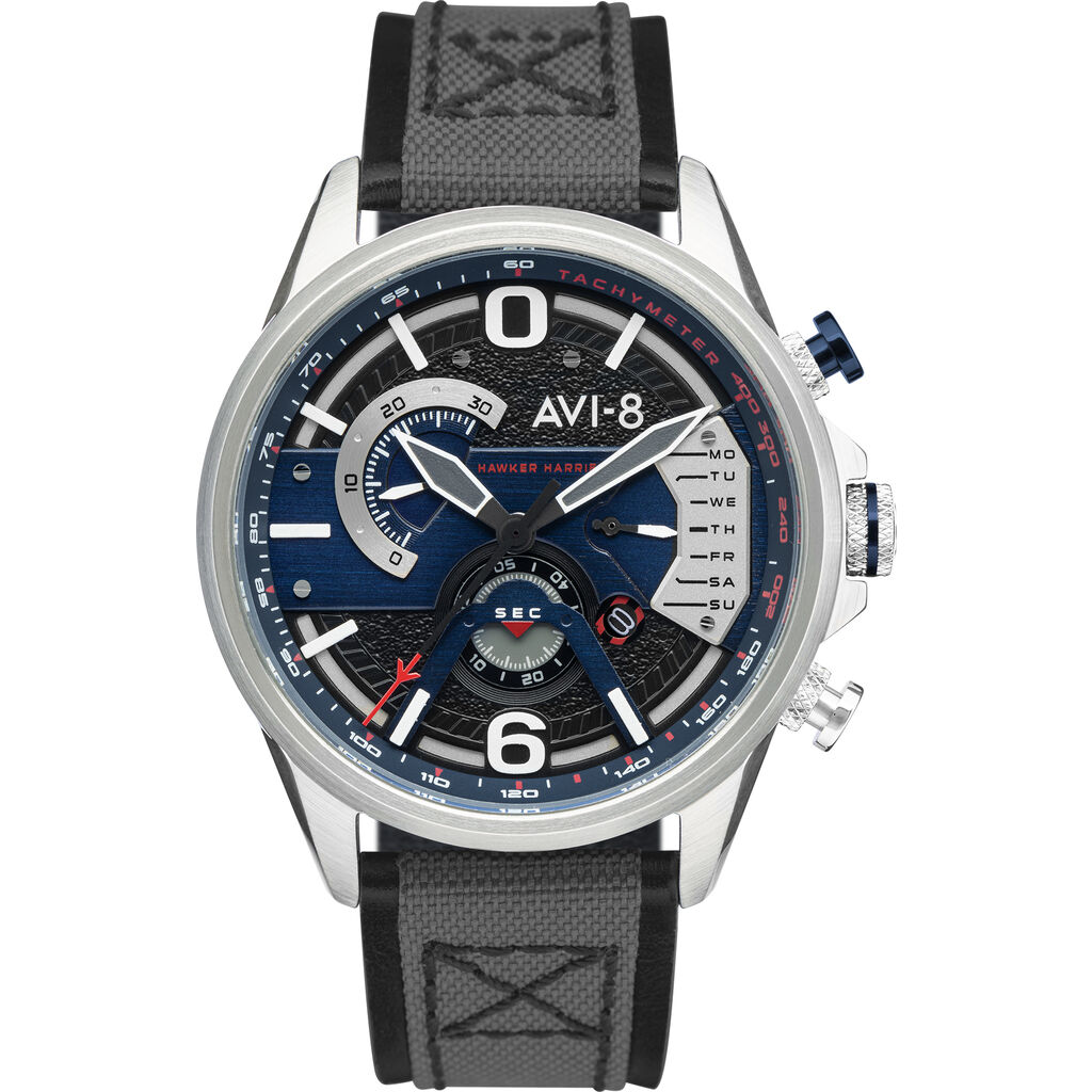 In the annals of aviation history, perhaps no fighter plane stirred as much controversy, excitement and technological wonder as the Hawker Harrier "Jump Jet", which flew for the Royal Air Force and for the US Air Force during the latter part of the 20th century. This incredible aircraft, powered by the famed Rolls Royce Pegasus series of engines provides the aesthetic backdrop for Hawker Harrier II Dual Retrograde Chronograph timepieces. Measuring 45mm in diameter the case fits snug thanks to the carefully articulated polished lugs, which hugs the case to the wrist. With a colored anodized aluminum chronograph pusher and matching detail on the crown, the strong circular lines of the case are complimented with appropriate yet finessed detailing that is striking to behold. Inside the case lies the precision Japanese made chronograph retrograde movement that reads off day, date, seconds, minute and 30m readout via a perfectly balanced series of hands, circular discs and registers all precisely weighted to offer clear cut information at an instant whilst never compromising on the time reading functionality of the watch. The hour and minute hands are sword-shaped in a classic aviation style, proportionately built-in to stay in sync with the rest of the timepiece's generally modern feel. Crowning this symphony of lines underneath the lens, the chronograph seconds hand is arrow-shaped in a harmonious bi-color execution again hinting at the watches aeronautical DNA. The strap attaches wearer to watch with a combination leather and canvas strap with stitching designed to echo the harnesses and belts holding the pilot to the sheer potential power of the Harrier.