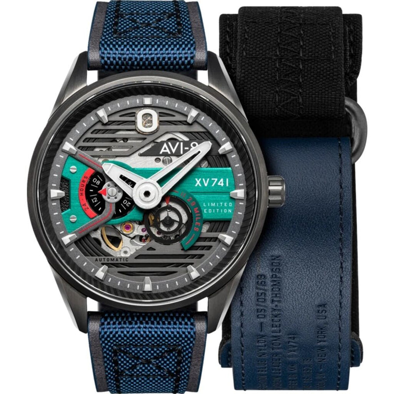 Inspired by the code name Operation "Blue Nylon" given to the XV741's participation in the air race, a comfortable leather and nylon strap been designed to attach the case to the wrist. For even greater versatility, each watch comes with an additional nylon and canvas, Velcro-release cuff-like strap.