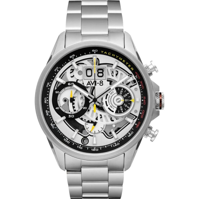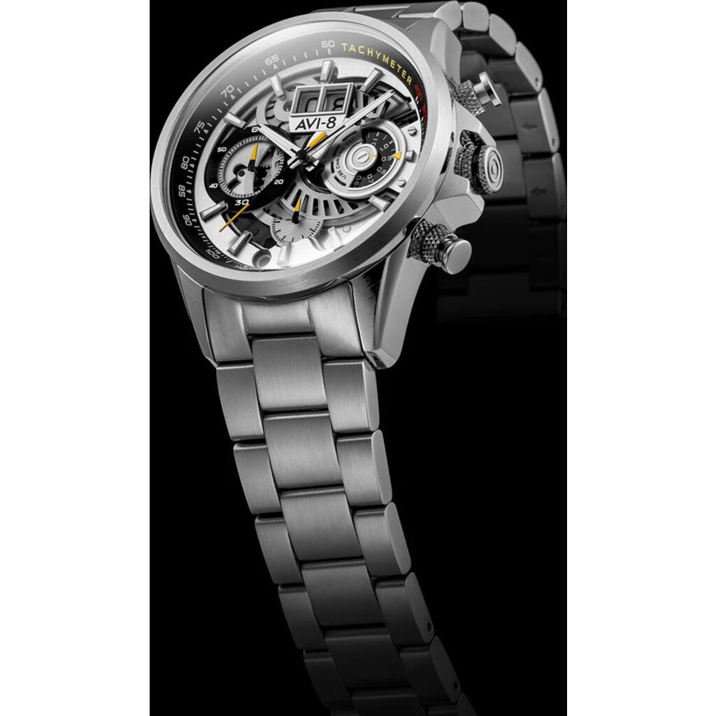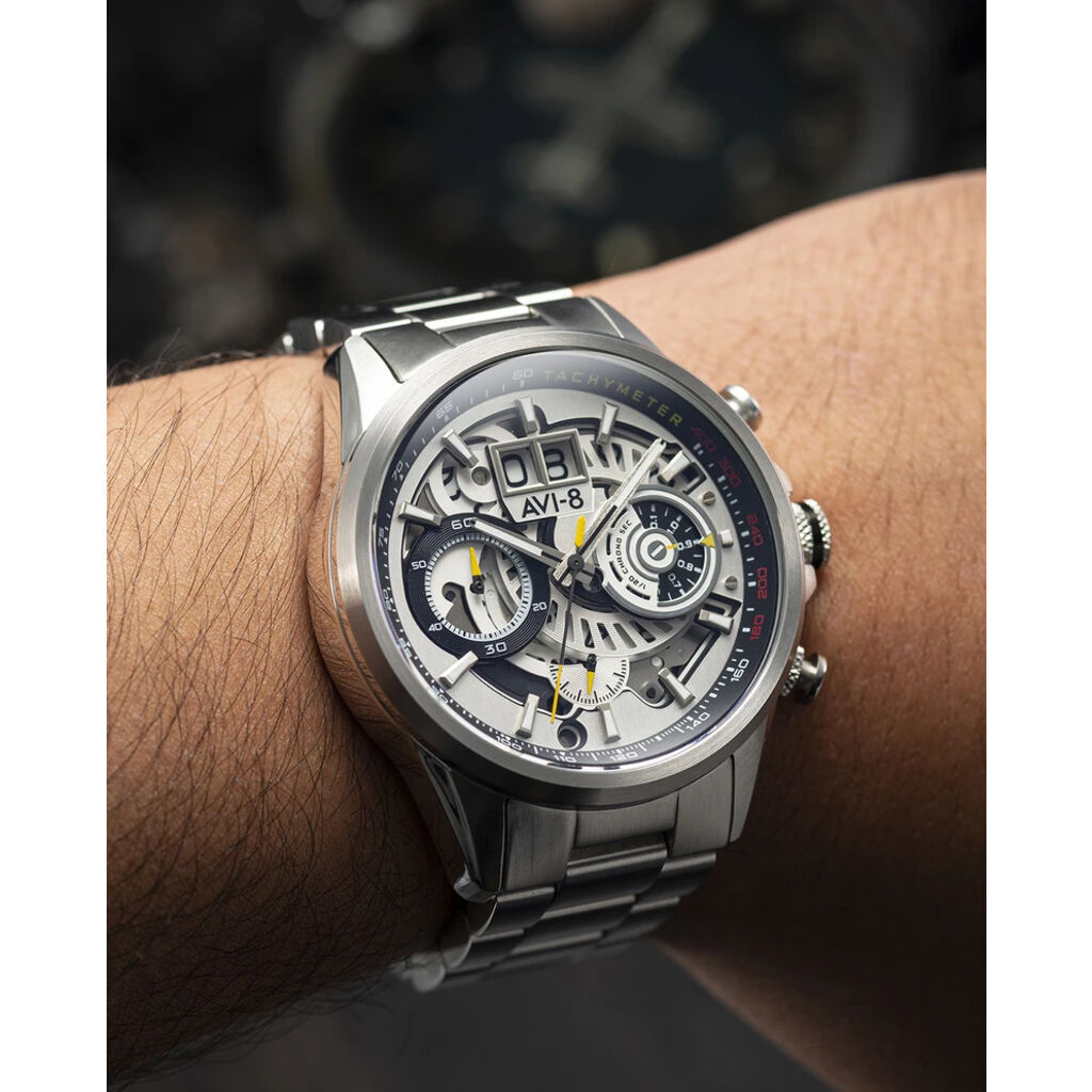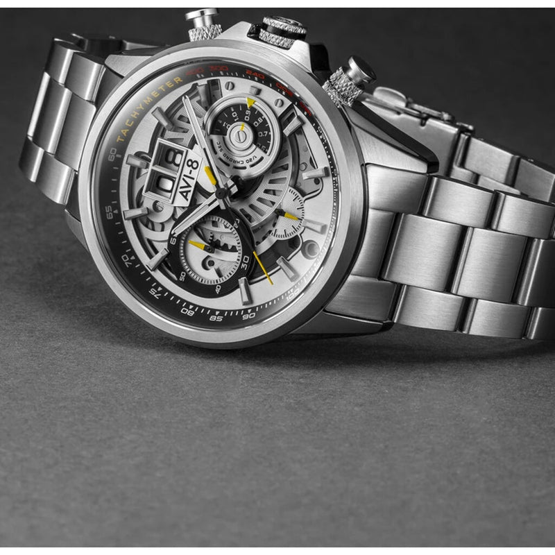 At first glance the Matador is a complex jigsaw of gears and wheels, which are precisely layered on top of each other as a dynamically designed piece of aviation inspired timing instrumentation. The sturdy case measures 45mm in diameter with a carved case back that echoes the turbine blades of the Rolls Royce Pegasus engine inside the Harrier. A hardened mineral convex lens with anti-reflective coating frames the mechanics underneath resting on the case bezel perfectly.