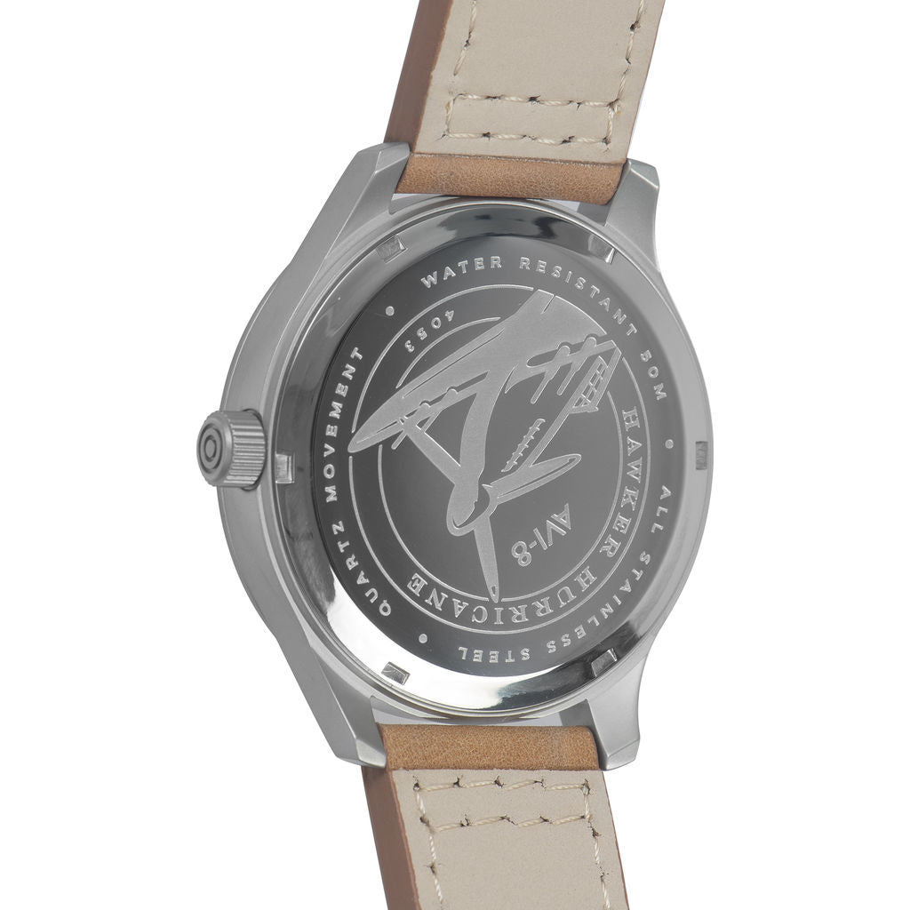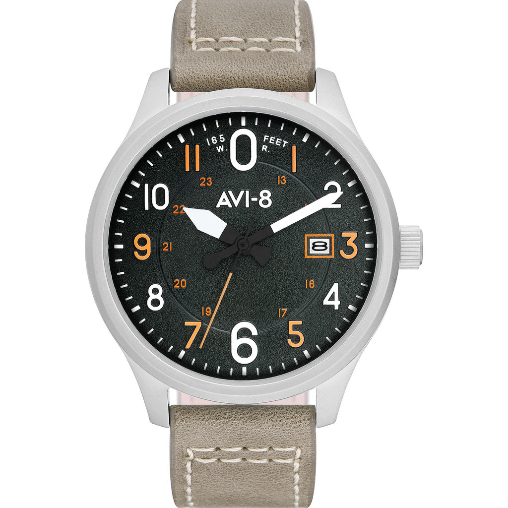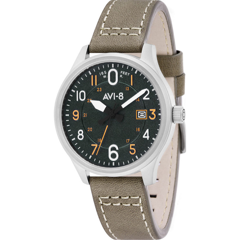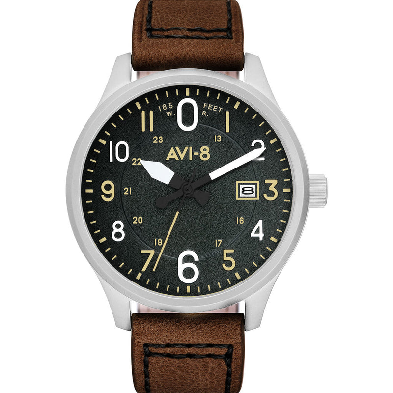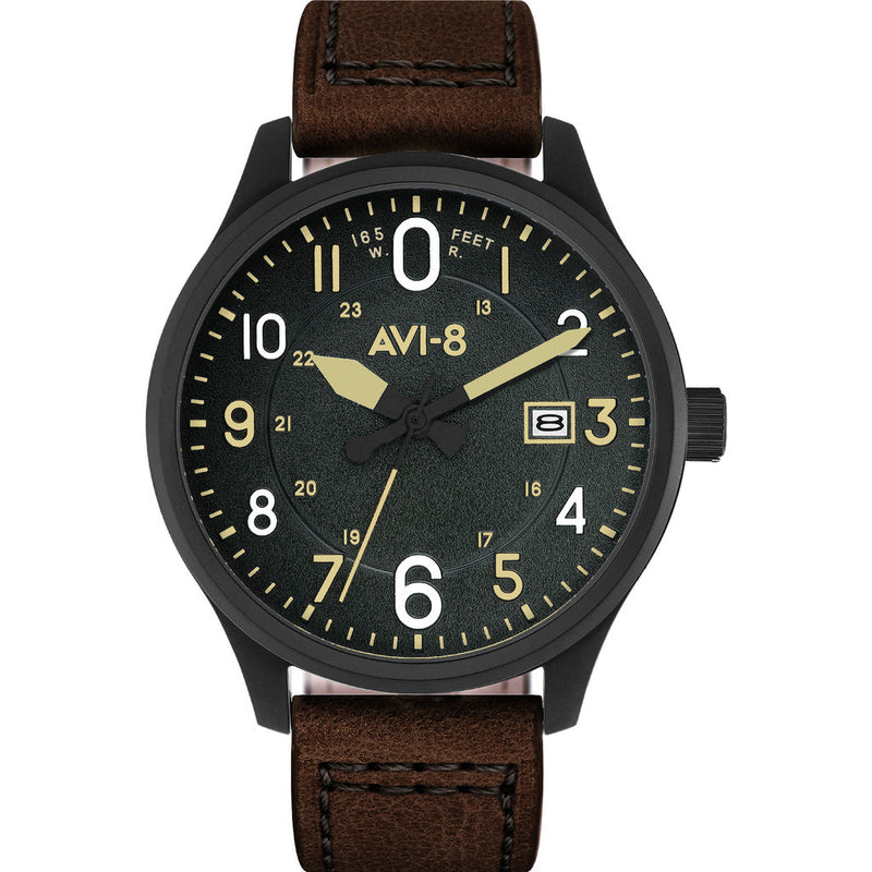 AVI-8's Hawker Hurricane AV-4053 watch is combined with a Military Analog display to read military time. Tradition and heritage of an era gone by. The cockpit inspired detailing, showing clear calibration of hour and minutes and a date display are housed inside. The hand carved vintage design crown is a reminder in function and design of the inspiration for this timepiece. Simple and classic for an everyday look.