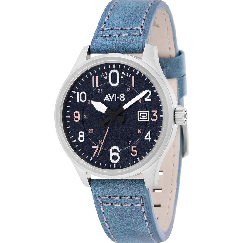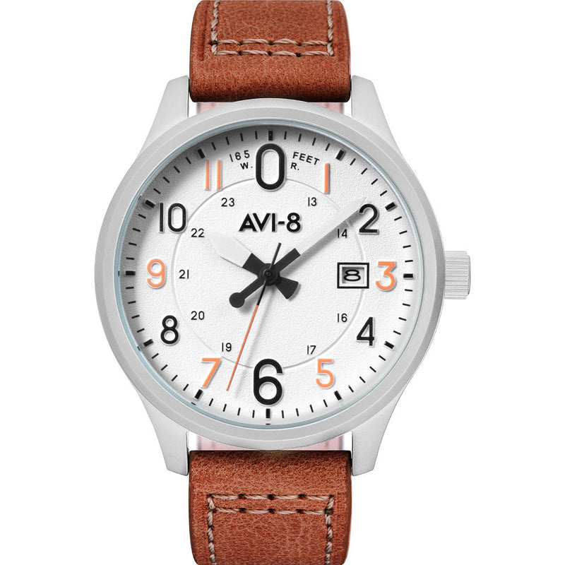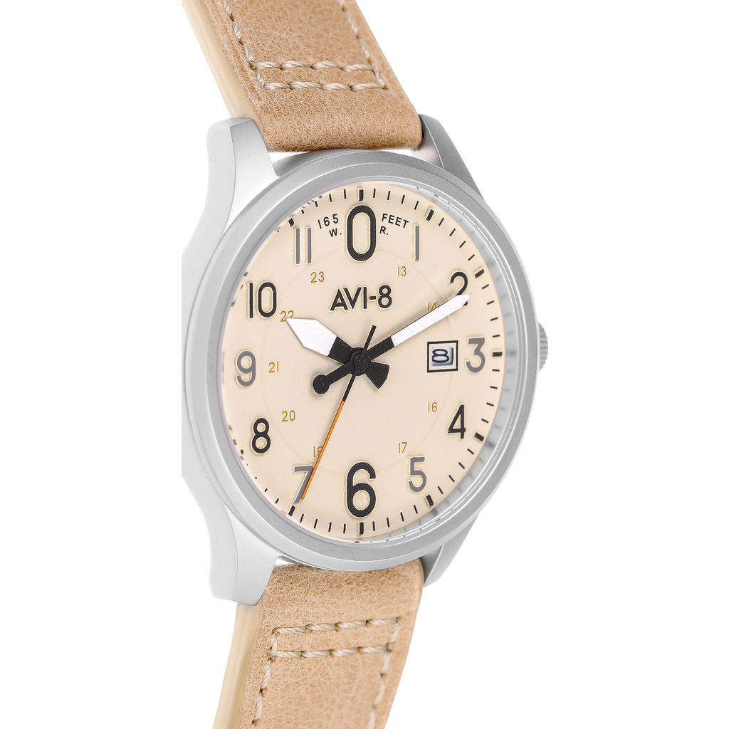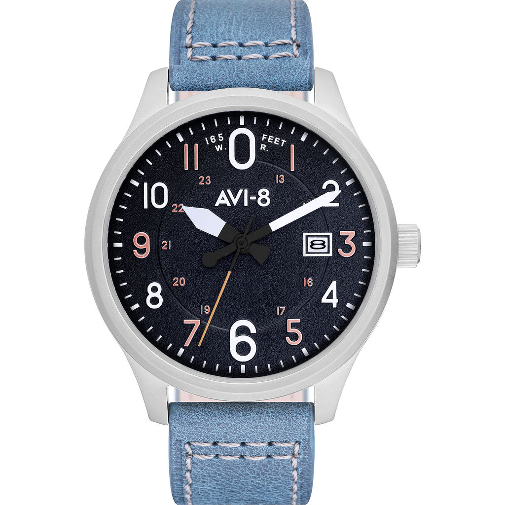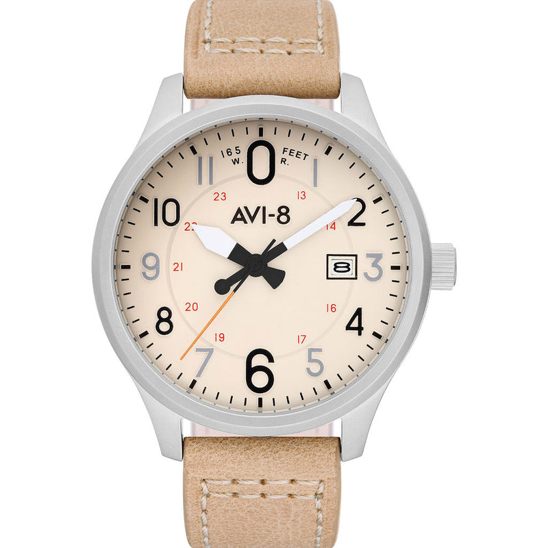 AVI-8's Hawker Hurricane AV-4053 watch is combined with a Military Analog display to read military time. Tradition and heritage of an era gone by. The cockpit inspired detailing, showing clear calibration of hour and minutes and a date display are housed inside. The hand carved vintage design crown is a reminder in function and design of the inspiration for this timepiece. Simple and classic for an everyday look.