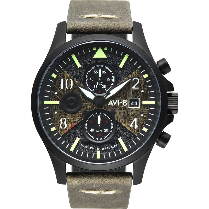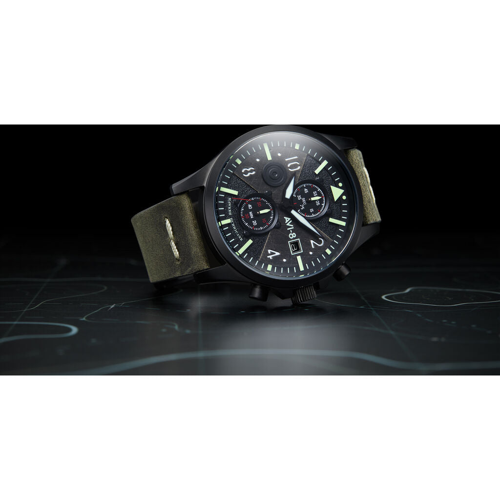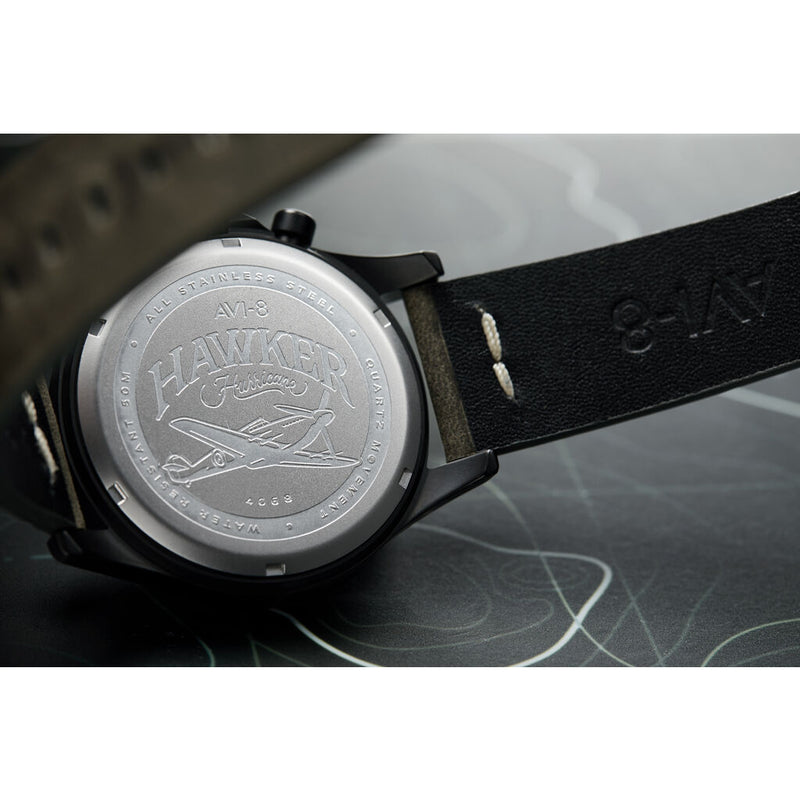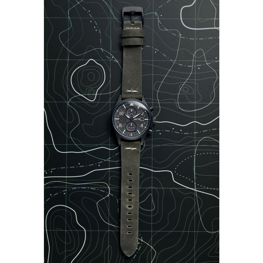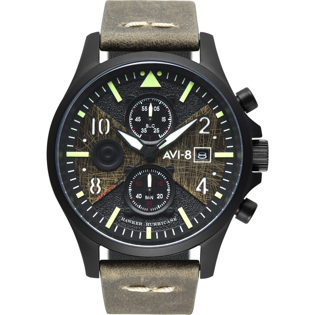 In commemorating Bulman, who was a chief test pilot at Hawker, AVI-8 looks to reflect and pay tribute to the behind the scenes efforts of engineers, test pilots and designers all working with the most critical of briefs, the very defense of their country under the most trying of wartime conditions. Measuring 45 mm in diameter the Bulman has a deliberately subdued look at first glance with a bead-blasted matte finish to the case. The dial harmonizes a classic pilot watch outlook with a cockpit inspired design. Instrumentation like chronograph subdials sits at the 12 and 6 o'clock position with a raised debossed tone on roundel at the 9 o'clock position and date display at the 3 o'clock position. Arabic and baton-shaped hour markers frame the watch perfectly with cutaway detailing with a luminous under dial giving clarity and legibility in all lighting conditions. Classically shaped arrow or "Fleiger" style hands are suitably lumed , precisely proportioned and balanced on the watch. The strong bold lines belie a subtlety and layering of the dial which includes a finely distressed layer of dial work marries well with the vintage military-inspired aesthetics of the watch.