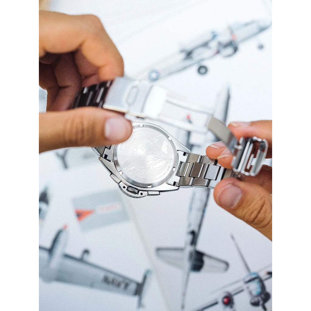 The dial of the Blakeslee Chronograph leans on both the inner and outer detailing of the P-51 Mustang. Carefully considered and perfectly proportioned, the dial is an effort in legibility and visually arresting layout.