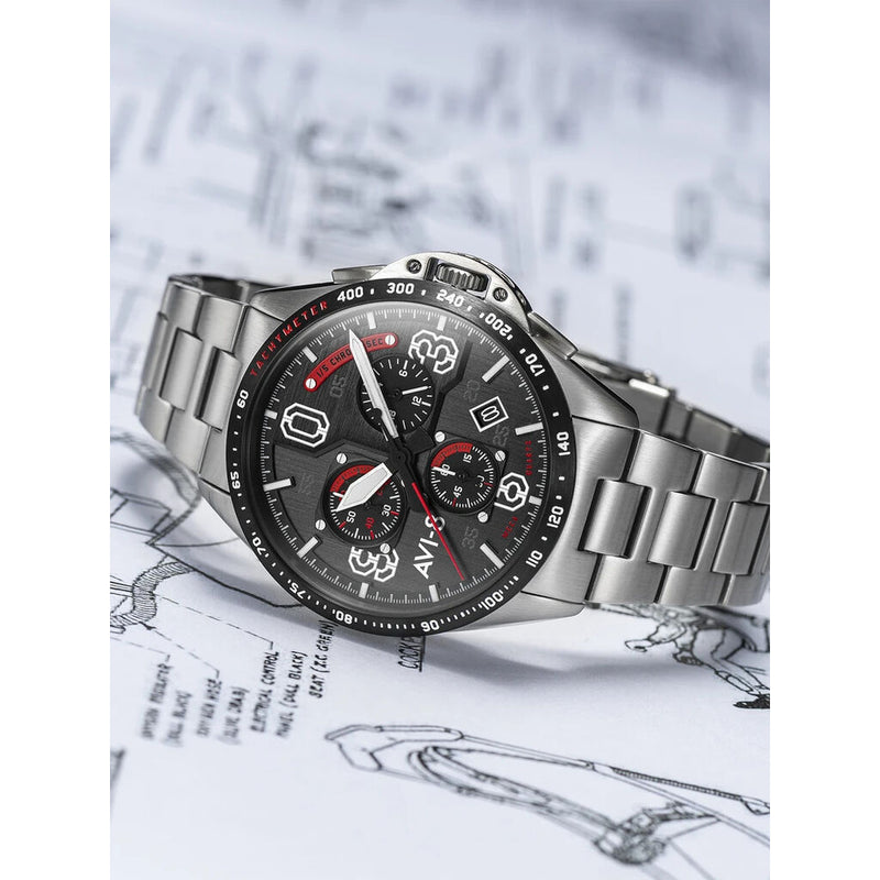 Using the very shape of the P-51 Mustang as inspiration, a 43mm case flows and glides across the wrist with specific micro details that echo the machining and features of this iconic aircraft. The pushers in particular are custom built and shaped within the line of the wings and fuselage.