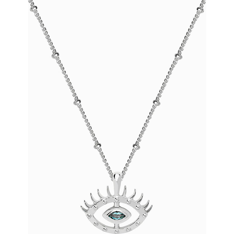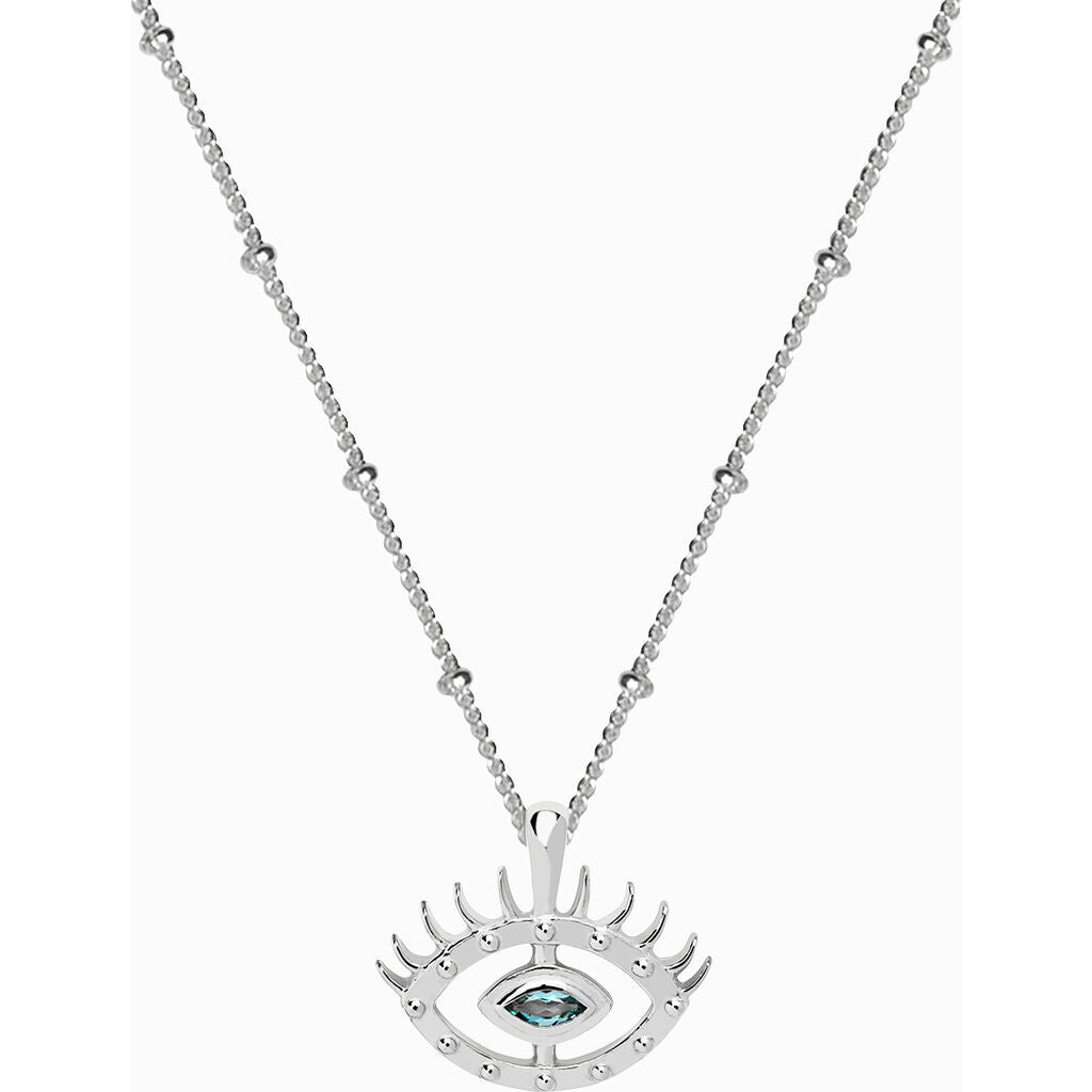 The evil eye is an ancient symbol that has protected people from the curse of the evil eye since 3,000 B.C. in cultures around the world. The curse is cast by the malevolent gaze, which is said to bring harm to another's good fortune. Wearing an evil eye charm can help dispel or ward off the evil eye curse. This evil eye is accented with a marquise-cut Swiss Blue Topaz, a gemstone associated with communication, intelligence, and is said to help alleviate anxiety.