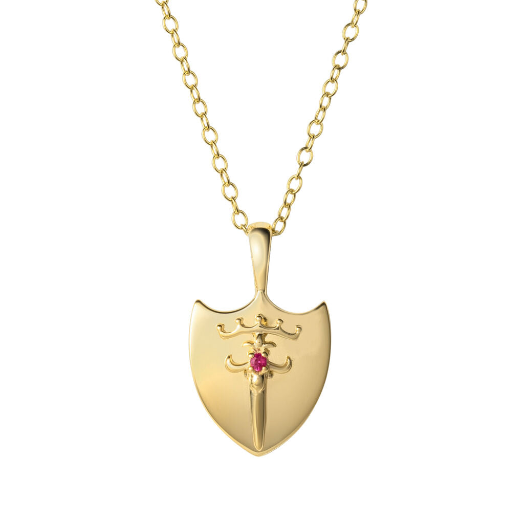 The Shield Goddess Charm is designed to bring strength and protection to its wearer. It is decorated with a genuine ruby, a gemstone worn by great leaders as a symbol of courage and passion.