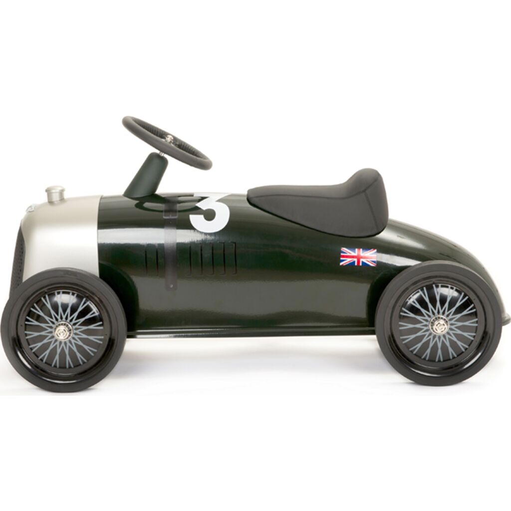 A partnership with Bentley Motors Limited. We are glad to introduce you our new ride-on Bentley Heritage, inspired by the Legendary 4.5 Litre Le Mans Winning race car of 1927. The Bentley Heritage celebrates Bentley's glorious history, with its aerodynamics silhouette, this racer is made for drivers who are not fazed by anything. It was created through a partnership with Bentley Motors Limited. Inspired by the famous Bentley Blower, which is known for winning the 24 hours le Mans race and being James Bond's first car! Fall for its deep green colour, an exact replica of the 1920 vehicle colour and its chrome grill topped by the Bentley logo. As a premium Ride-on, the seat and the steering wheel are leather made for the comfort of toddlers. With a reminder of its British origin, find its flag on both sides of the racing car.
