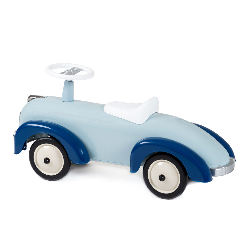 A real little vintage car for baby from 1 y.o: A sleek design, an aerodynamic design and a metallic blue body! The ultimate for apprentice pilots! Comfortably seated on his Blue Speedster, well stable and robust, hands on the wheel, feet on the ground, your child will quickly become a master of the wheel! This blue trotter is equipped with a real functional steering. Baby will quickly get his bearings on his new car and the rubber tires will help him stay stable and move silently around the house. With its metal bodywork, this trotter is inspired by the old cars of the 1950s. Equipped with such a car, the little pilots will be able to imagine beautiful stories and go on an adventure.