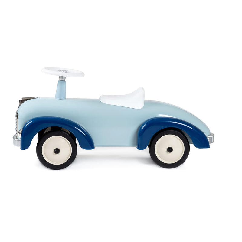 A solid and durable toy: This Speedster Blue Baghera baby car is made of metal. It is therefore very robust and will accompany the child in all his adventures as a young pilot. Its large wheels are topped with rubber tires, which allows this Baghera carrier to travel silently on any type of terrain (house, asphalt, gravel, grass, etc.). With its plastic mudguards, baby will be well protected and will be able to play car safely. The front and rear bumpers will protect the wearer from minor accidents.
