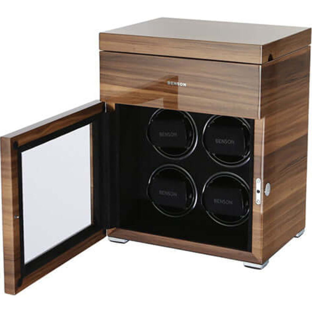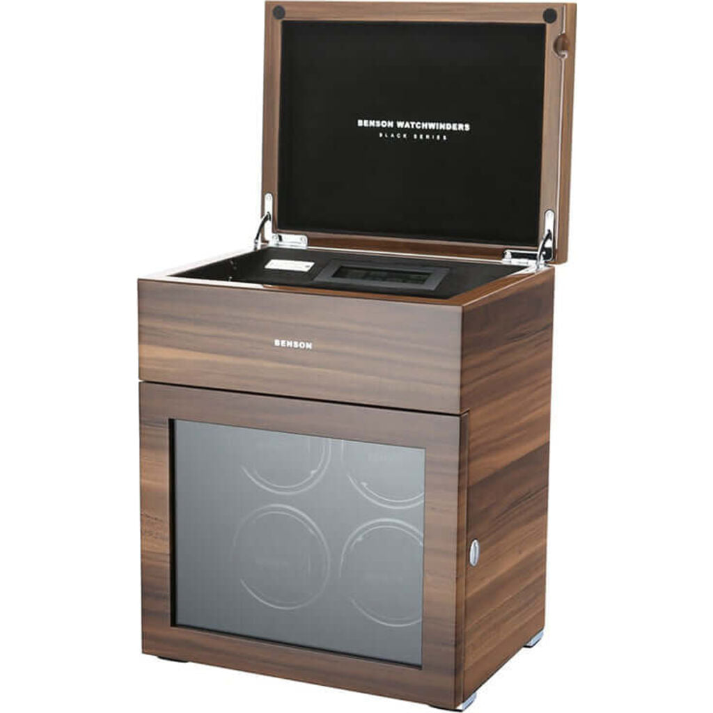 Benson Black Series Winder 4 Rotors Limited Edition 4.16.WL. Four rotors watch winder with a start and stop system and powered by an adapter. Winder can be programmed to rotate in 3 positions clockwise, counter-clockwise, Alt and the number of turns per day. It operates manually and with a control remote. Walnut lacquered wood finish, mineral glass and luminous LCD display. Large watch holders that can accommodate regular size to extra-large watches. Additional storage for another 3 watches. Dimensions 34 x 24 x 26cms and weights 7000 grams.