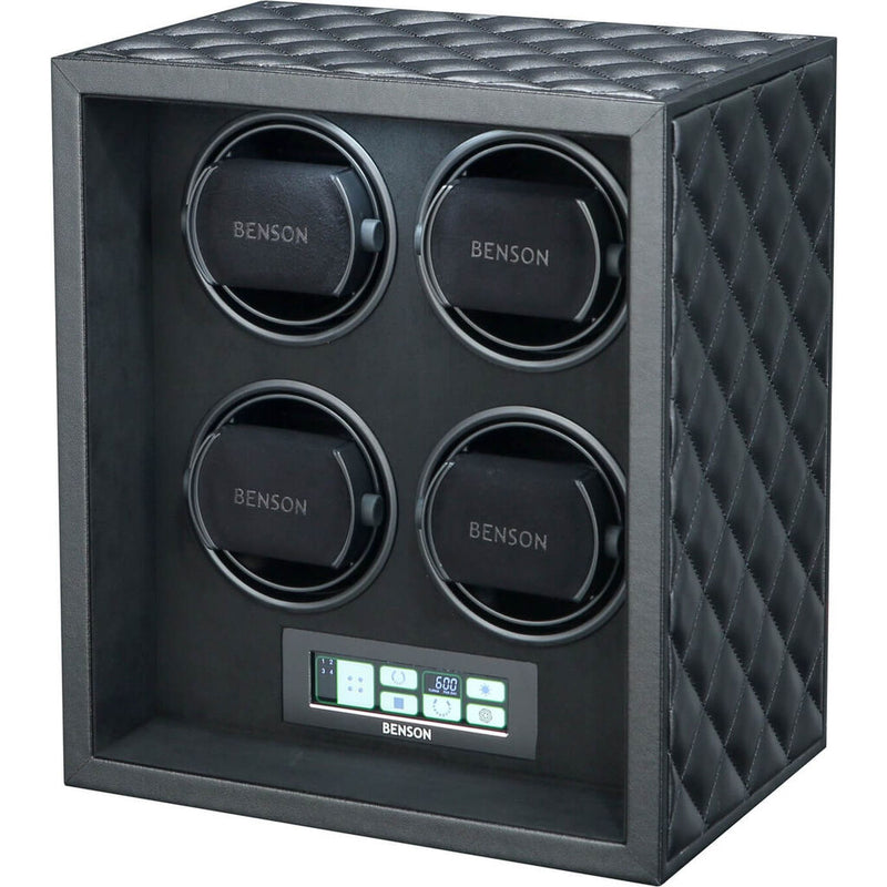 The Benson Black Series Leather watch winders belong to the newest generation of this Dutch brand. The collection contains models for winding 4, 6 and 8 automatic watches and is available with a black leather or carbon fiber leather exterior. The beautiful exterior has padded leather for an extra chic look. This Benson Black Series Leather 6.22.BL watch winder is suitable for winding 6 automatic watches and equipped with a black padded leather, touchscreen, LED lighting and flexible watch holders. You can wind any automatic watch in this watch winder, regardless of brand or model. Because the TPD (turns per day) and the direction of rotation can be set per watch, you are completely flexible. The Benson Black Series Leather 6.22.BL watch winder comes with a 2-year warranty, certificate, adapter and manual.