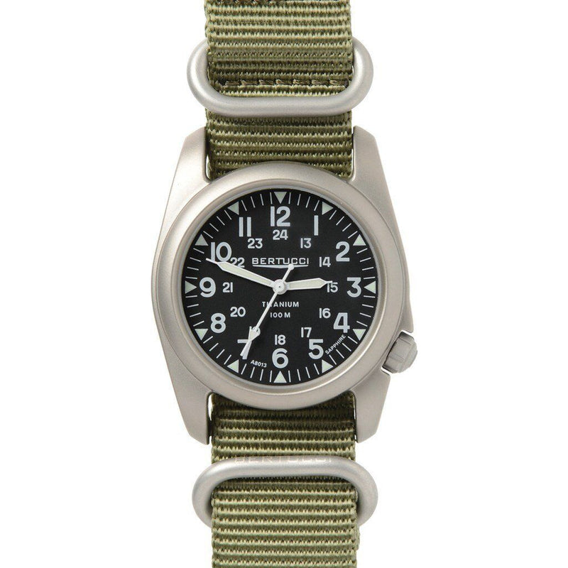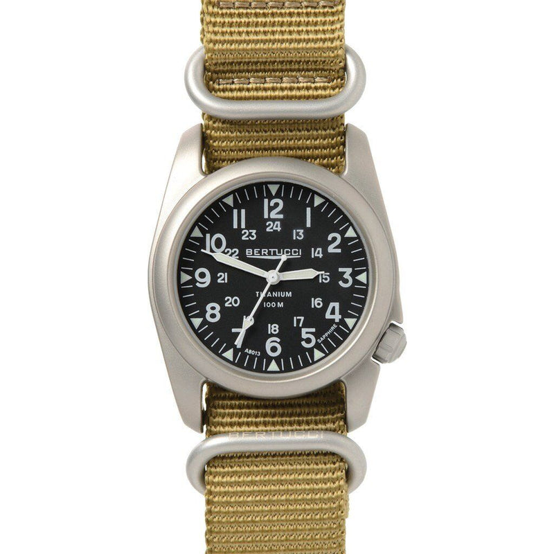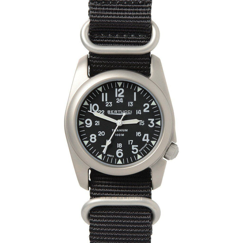 The Bertucci A-2T Nylon has it all. It features our long lasting and comfortable E-Type G10 Nylon webbing band... which takes the "traditional Nylon" band and enhances it with a heavier gauge all-nylon construction and solid matte finish stainless steel hardware... a perfect combination with our legendary A-2T solid titanium U.S. Patented Unibody™ 40 mm case. This watch has it all for long lasting, reliable and accurate time keeping.