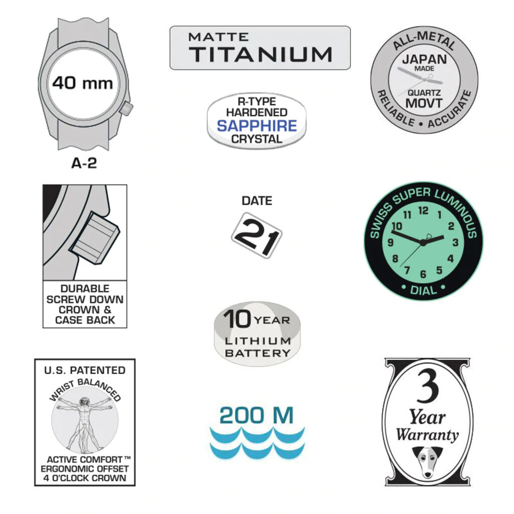 The A-2T Super Classic Luminous is an enhanced special edition of our legendary A-2T Original Classic titanium field watch. Performance improvements include 200 M water resistance, R-Type Sapphire crystal, 10-year battery life, and specially treated all Swiss luminous dial for easy viewing in all light conditions, the dial will continuously glow without the need to push a button or recharge a battery. The mono-colored black markings and hands-on white dial design provide a functional, distinctive, classic, and versatile style. A watch that has it all.