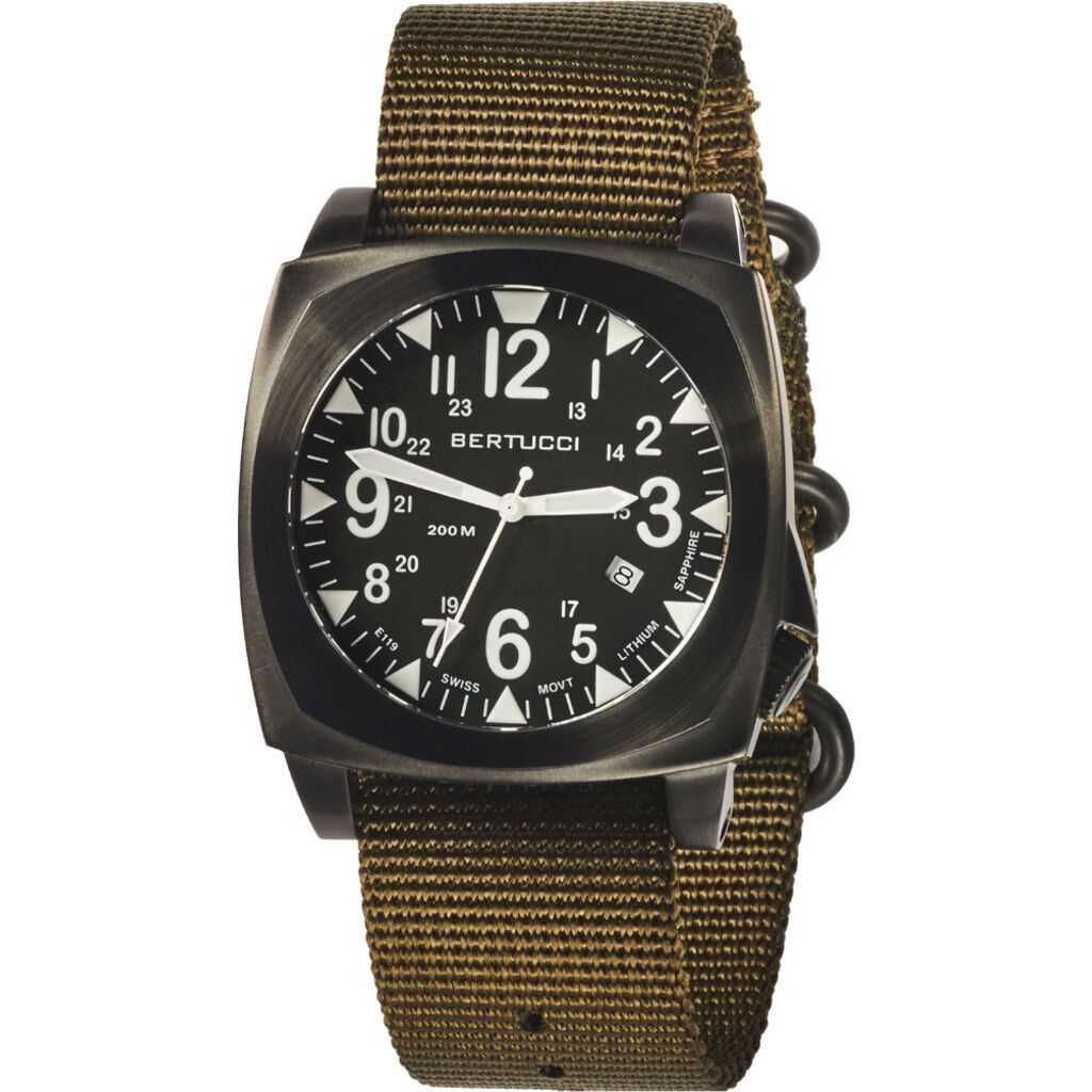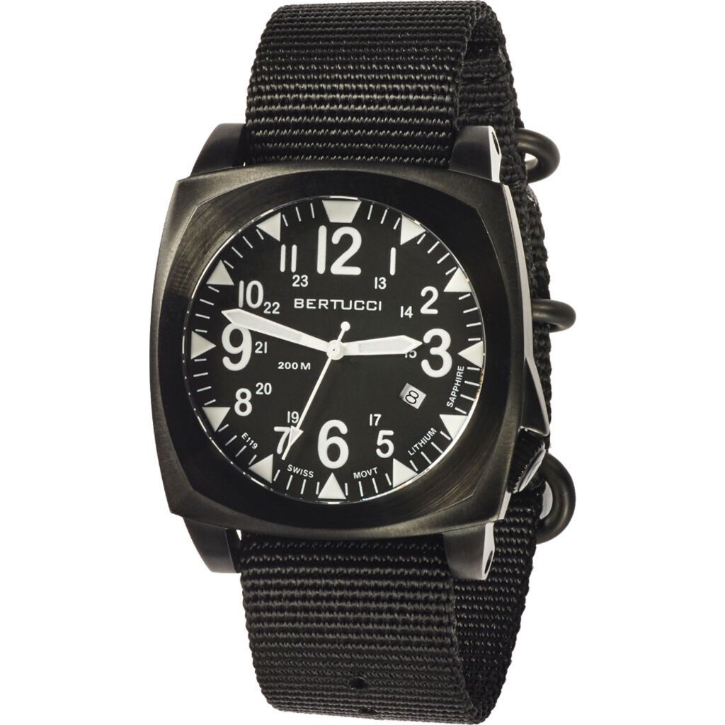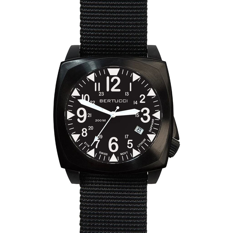 The E-1S Ballista™ features professional tactical design in a durable 44 mm x 55 mm tonneau case. All stainless steel components... case, crown, case back, band hardware are ION (or PVD) finish black. High performance components include: A rugged screw down crown & case back, 200 M water resistance rating, scratch resistant hardened domed sapphire crystal, Swiss super luminous markers & hands, lithium 10 year battery life powered precision Swiss made movement with a low battery alert, functional easy to read dial with 12/24 hour markings with date.