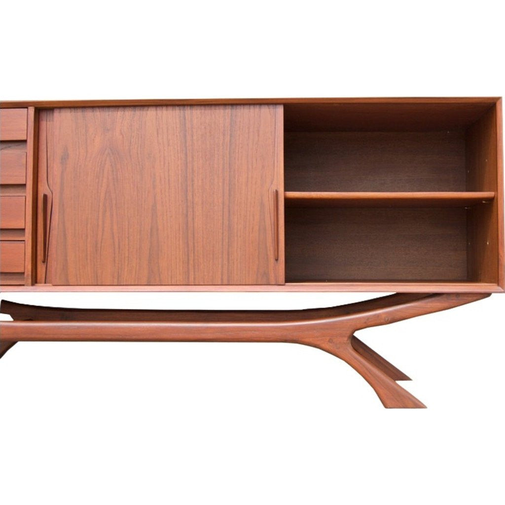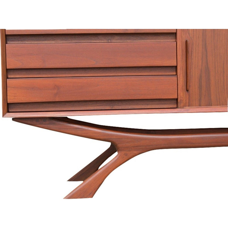Inspired by mid century furniture styles, Bowery and Grand makes each piece with quality materials. The Grand Sideboard is made with solid teak and a veneer teak wooden core frame. The Grand features four drawers, two adjustable shelves and two sliding doors.