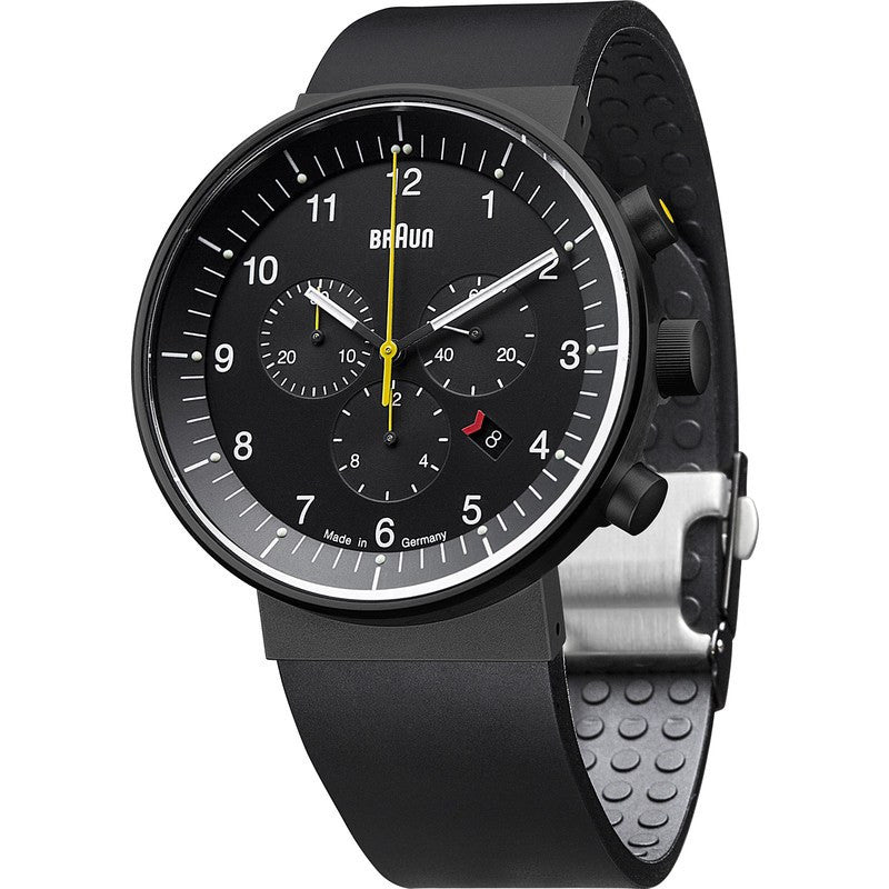 The Braun Prestige Chronograph Men's Watch is the epitome of a great men's wristwatch. Its sleek black design is carved out of one single block of steel. This one-piece construction eliminates the need for a case-back. The Swiss movement is mounted into the case from the top before being covered and sealed by the sapphire crystal and in turn removes the element of potential leakage. The bottom part of the watch is tapered stylishly and the band lugs are attached with a new method not seen in conventional watch construction. The Braun Prestige fashion men's watch has a 2 year warranty.